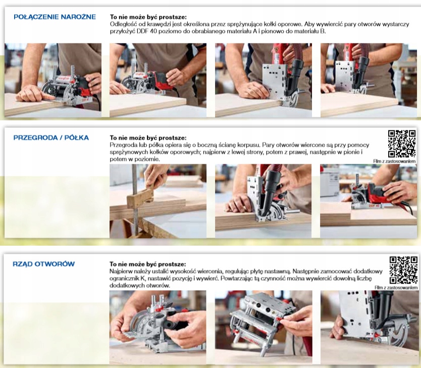 - Умные аксессуары делают дюбельный пресс DDF 40 удобным и многофункциональным станком. Благодаря разнообразию, в том числе ограничителей/судей, в большинстве случаев нет необходимости использовать шаблон или предварительно размечать материал. Хотите знать больше? В наших видеороликах показано множество различных способов использования DDF 40. Просто отсканируйте QR-код, чтобы узнать больше.