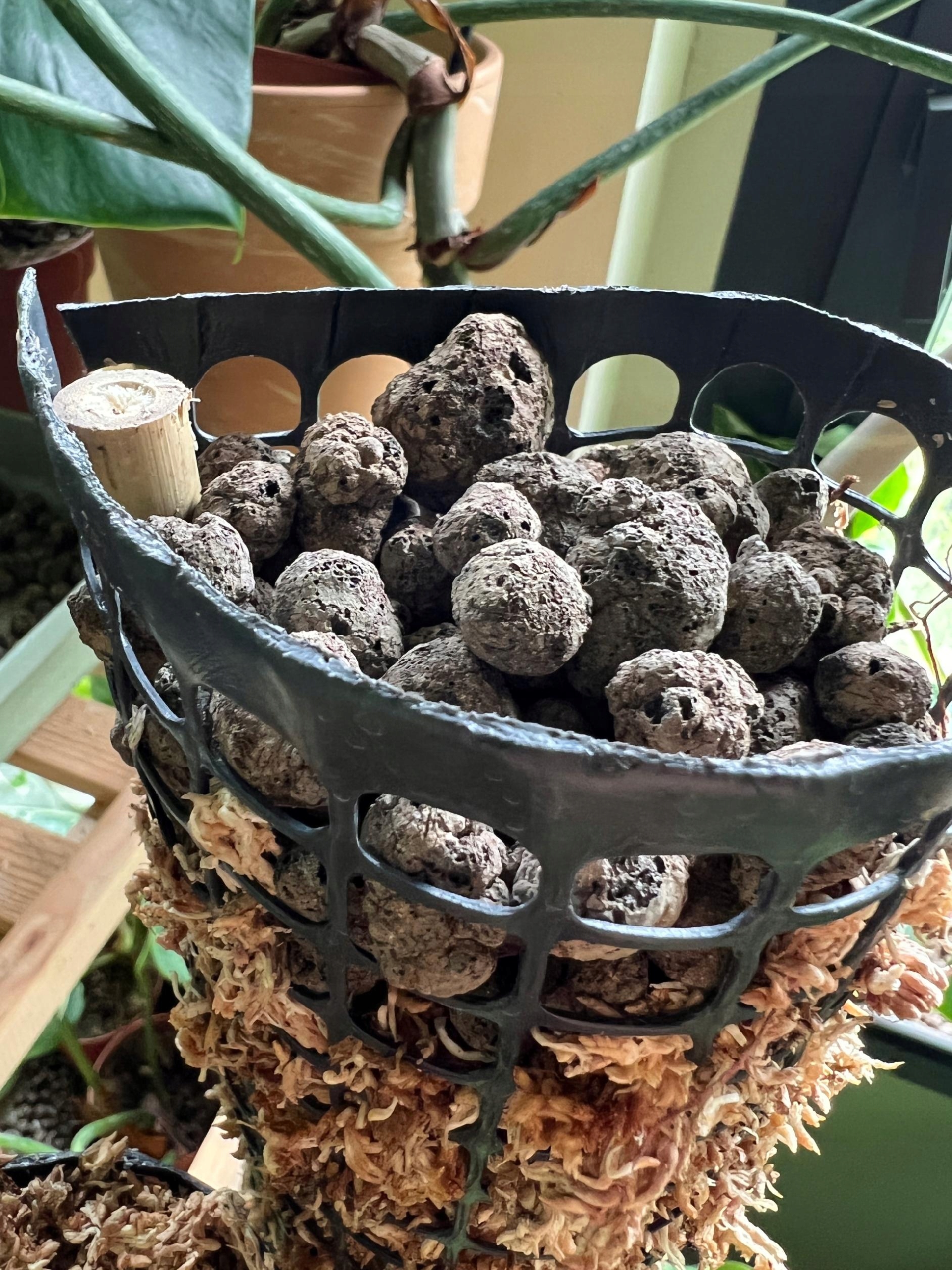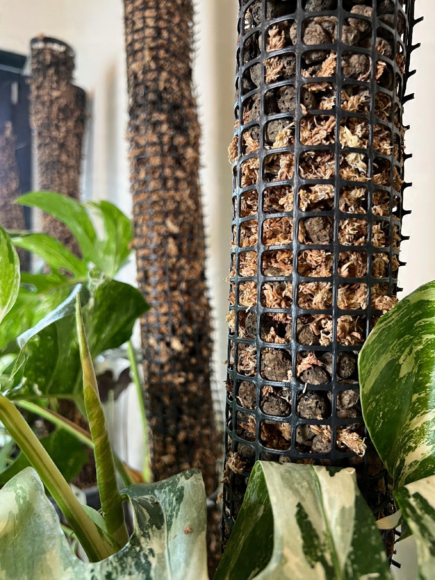 Если вы делаете кол диаметром 8 см, то в сетчатой трубке дополнительно сделаете слои керамзита и мха (как на фотографиях). Это гарантирует легкий полив и дольше сохранит влажность всего кола. В результате растение в будущем отплатит вам прекрасными цветами