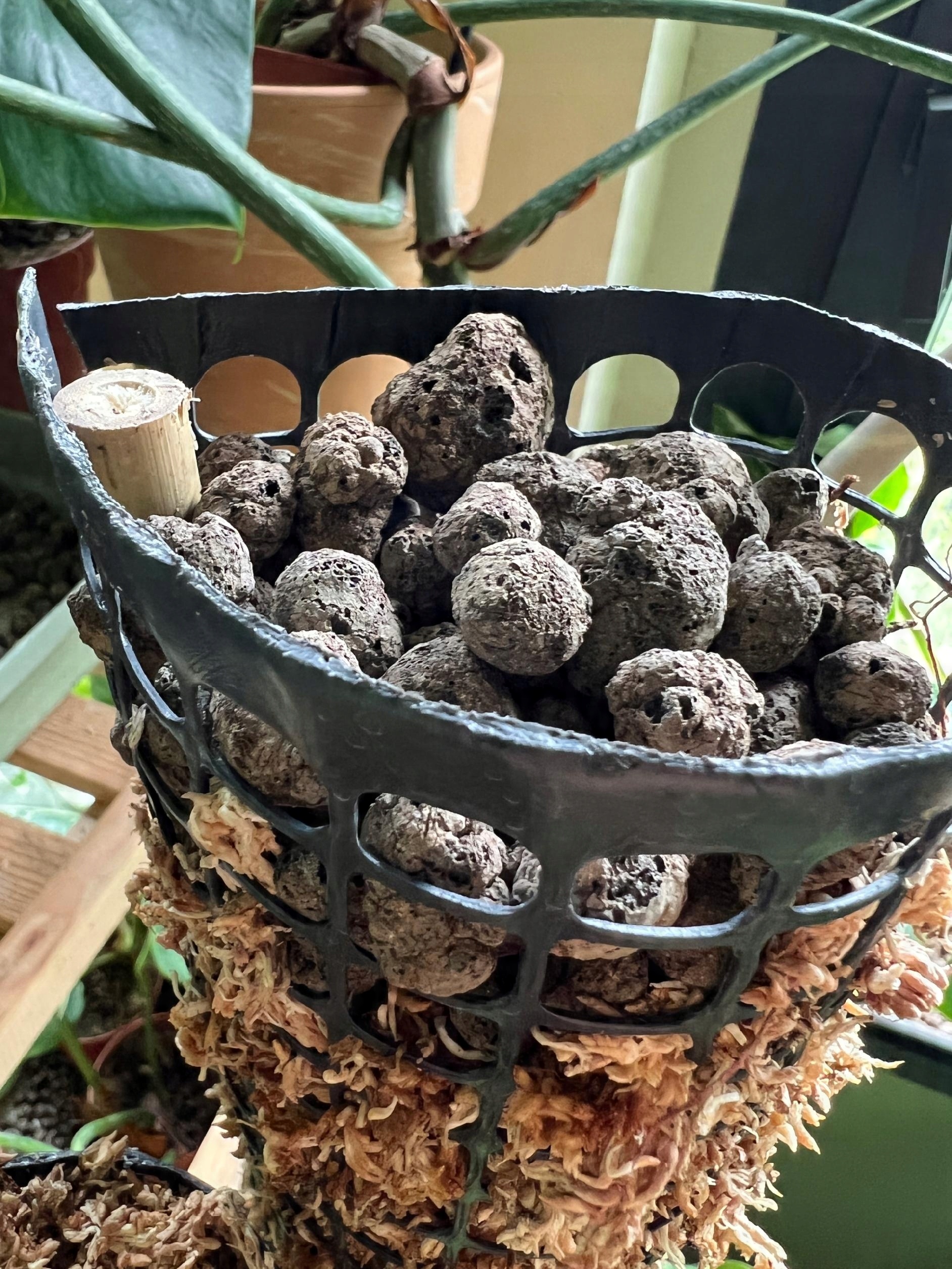 Если вы делаете кол диаметром 8 см, то в сетчатой трубке дополнительно сделаете слои керамзита и мха (как на фотографиях). Это гарантирует легкий полив и дольше сохранит влажность всего кола. В результате растение в будущем отплатит вам прекрасными цветами
