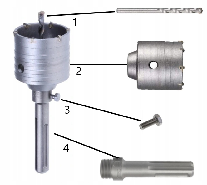 Он имеет удлинитель, позволяющий устанавливать его в патрон SDS+, а также стандартную зажимную головку в любое сверло.