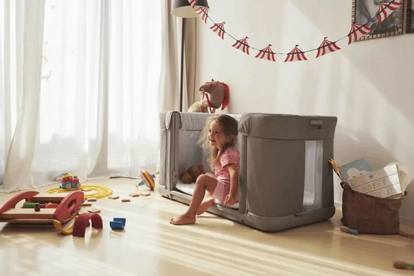 Чтобы превратить изделие в напольную кроватку для малыша, просто отстегните ножки и боковую панель. Благодаря этому ребенок может свободно пользоваться кроваткой, самостоятельно и безопасно залезая и вставая с нее.