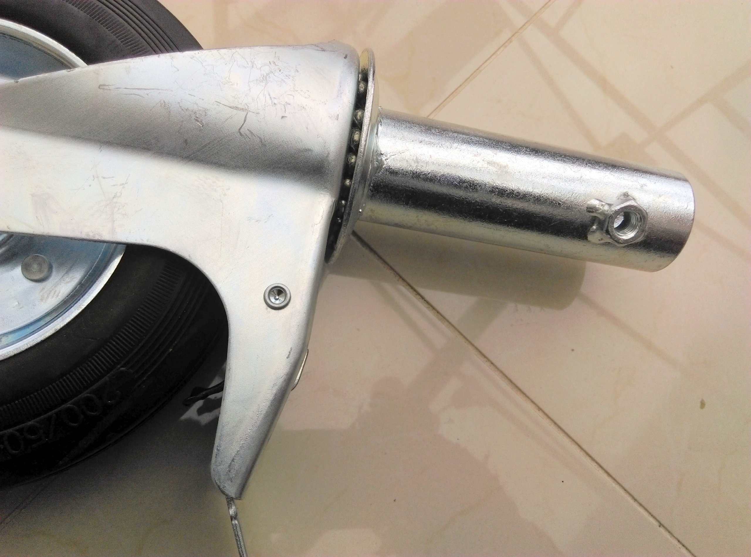 Колеса поворотные с тормозом, закрепленным на штифте, представляют собой комбинацию вилки из прессованного стального листа и колеса со стальной ступицей и покрышки из цельной черной резины. Поворотная головка вилки имеет двойные подшипники. Металлические элементы комплекта покрыты антикоррозийным хромоцинковым покрытием, в том числе и штифт.