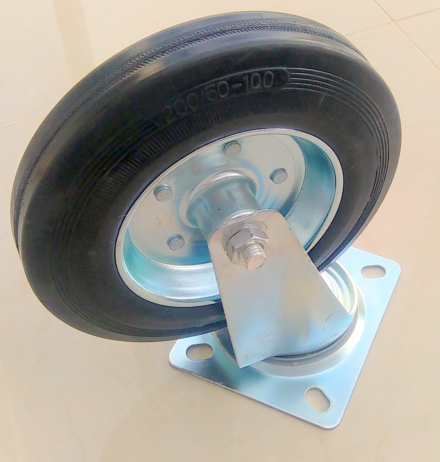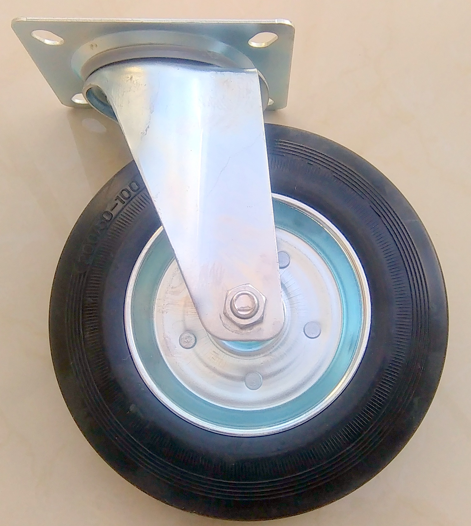 Колеса установлены на так называемых Пластина представляет собой комбинацию вилки из прессованного стального листа, колеса со стальной ступицей и шины из твердой черной резины. Поворотная головка вилки имеет двойные подшипники и защищена от грязи специальным пылезащитным уплотнением. Все металлические элементы комплекта покрыты антикоррозийным хромоцинковым покрытием. Тормоз блокирует колесо и головку.