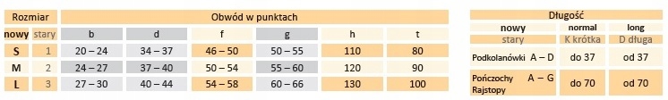 Размер измеряется в соответствии с размерами таблицы ниже. Ключевые размеры: окружность выше лодыжки, параметр d окружность ниже колена и g окружность бедра на 5 см ниже промежности.