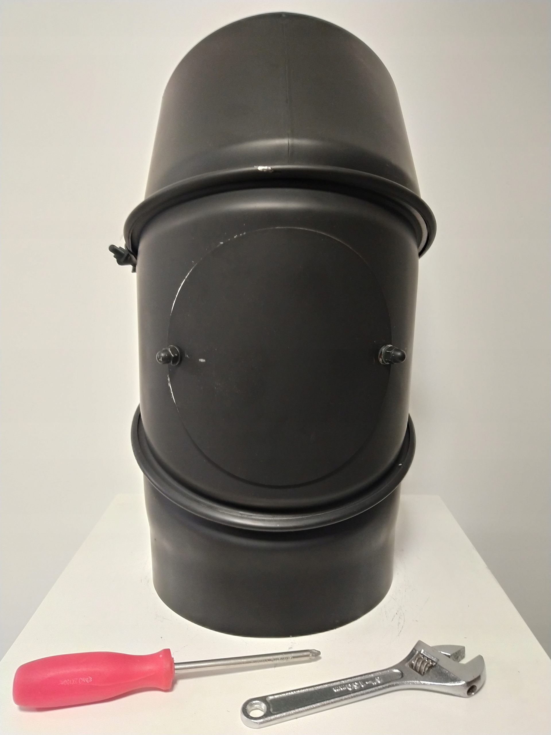 Колено регулируемое на угол 90*, 3-сегментное, предназначено для подсоединения дровяных каминных топок к дымоходу. Колено имеет так называемый ревизионный элемент. отверстие для очистки, через которое можно в любой момент проверить соединение. Благодаря использованию специальных зажимов соединение элементов колена получается идеально герметичным.