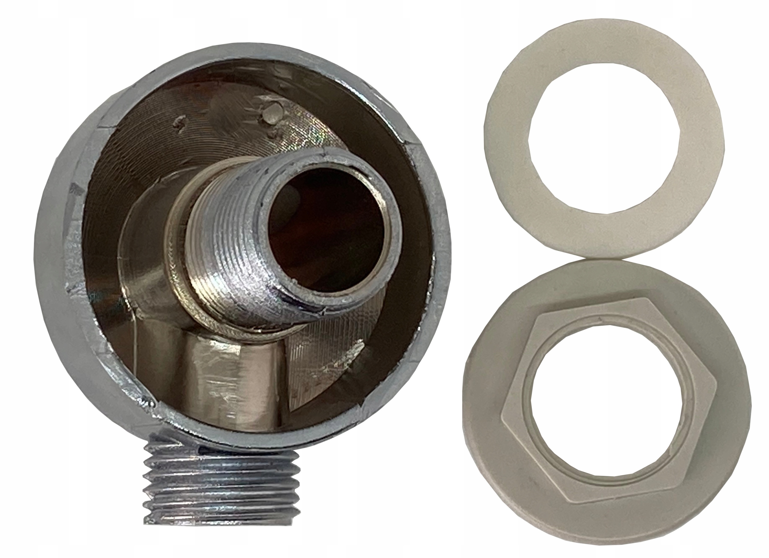 Колено, соединитель для душевого шланга гидромассажной кабины. Изготовлен из пластика, покрыт глянцевым хромом. Подробные размеры на фотографиях.