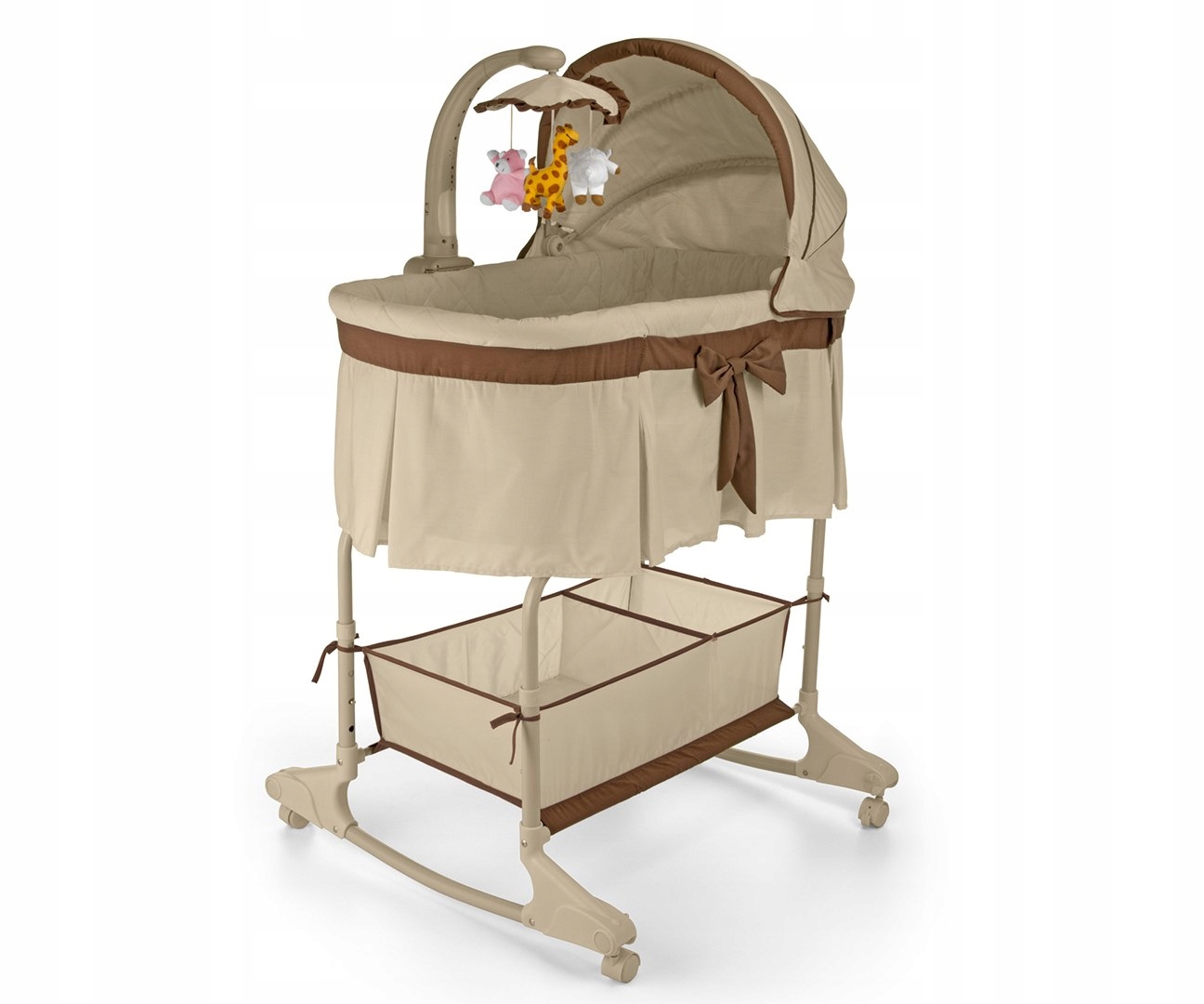 Сладкая мелодия впечатляет с красивыми цветами и функциональностью. Его большое преимущество заключается в том, что это многофункциональный продукт, это может быть удобная кроватка или традиционная колыбель. У него есть колеса благодаря, на что мы можем свободно перенести его в любое место дома или сада; Он включает в себя сеть комаров, которая защитит ребенка от насекомых. Колыбель мобильности дает большой комфорт, потому что ребенок всегда будет близок к родителям. У этого есть более низкая корзина, которая позволит нам держать необходимые вещи, всегда близкие к ребенку и реагировать на его потребности, не слишком уходя от него. Что очень важно, колыбель изготовлена из приятного на ощупь и воздушного материала, который можно вымыть, чтобы вы могли освежить колыбель в любое время. У него есть карусель с разноцветными животными и мелодиями. Эти функции привлекают внимание малыша, и музыка поможет успокоиться и успокоить ребенка. Колыбель имеет пониженную боковую стенку, которая включена в лампу, встроенную в карусель, обеспечит большой комфорт с повседневной и часто ночной уходом за ребенком. Для удобства родителя эти функции контролируются с помощью дистанционного управления. Следующим преимуществом является регулируемая высота на различных уровнях, что облегчает родителям утомить ребенка и обеспечить безопасность для малыша. Круги, которые можно легко заблокировать. стена, чтобы легко перемотать ребенка