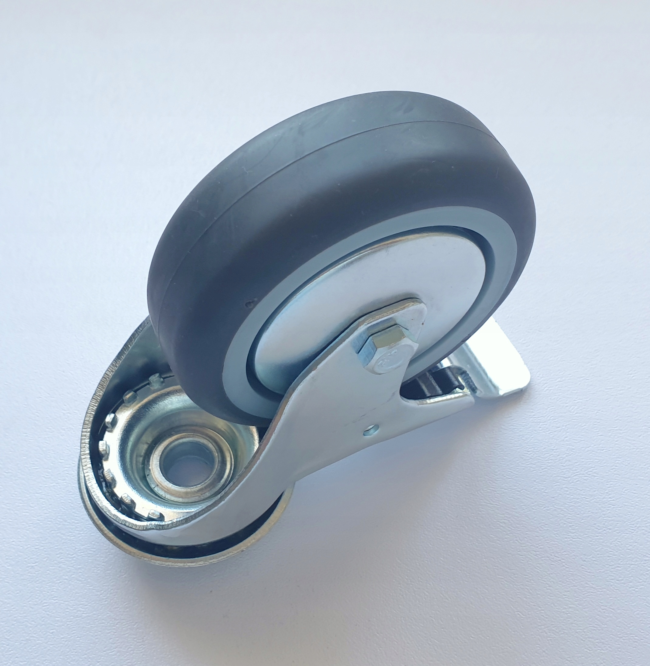 Колеса установлены на так называемых Пластина представляет собой комбинацию рабочей вилки из прессованного стального листа и колеса со ступицей из полипропилена и шины из графитовой термопластической немаркирующей резины. Поворотная головка вилки имеет двойные подшипники. Все металлические элементы комплекта покрыты антикоррозийным хромоцинковым покрытием. Тормоз блокирует колесо и головку. Известный производитель – мировой концерн.