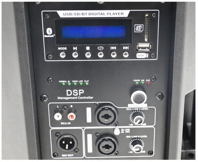 - light indicators : power, active signal, signal distortion, Preset DSP