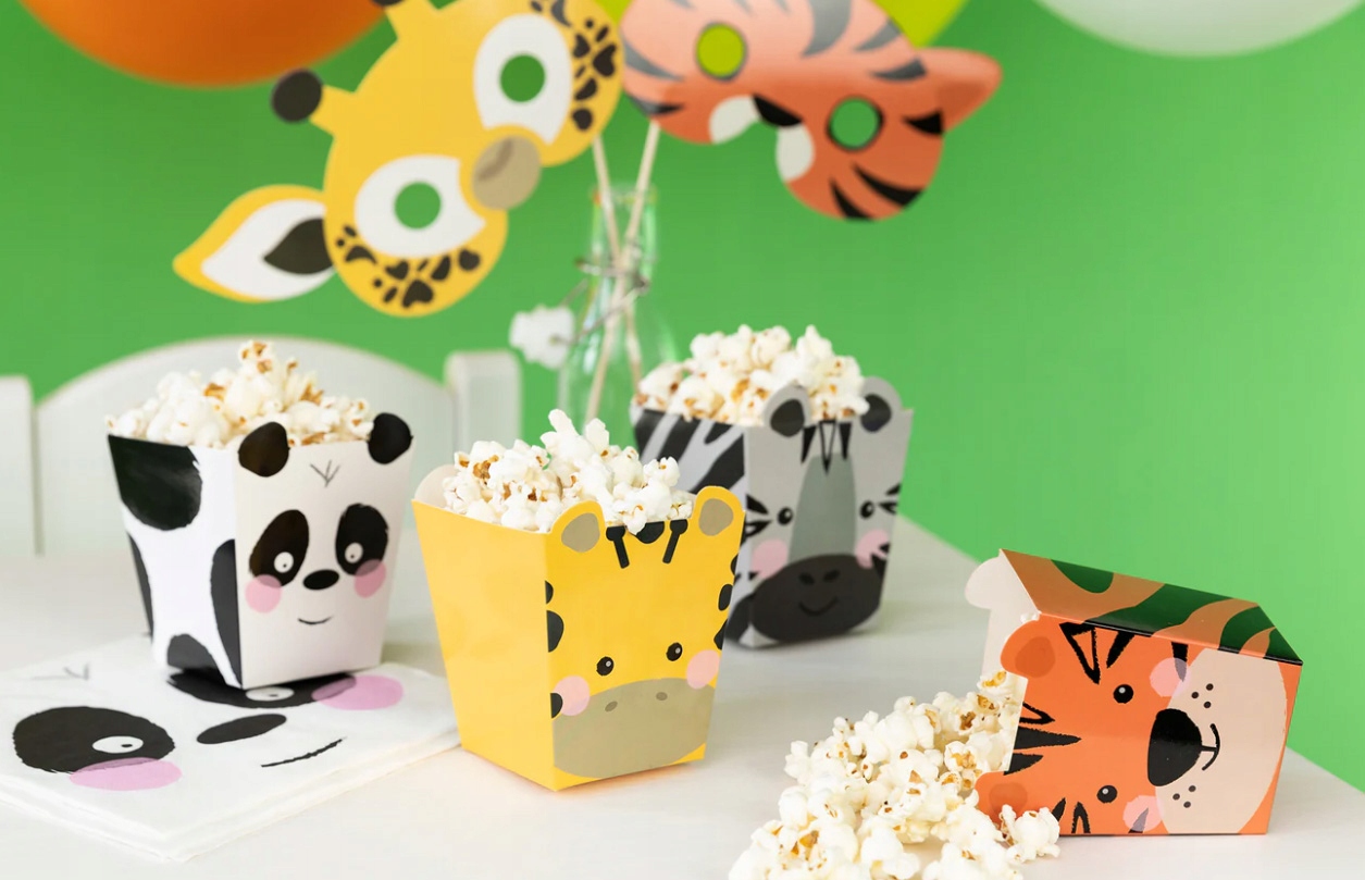 В набор входят 4 коробки для попкорна: зебра, жираф, тигр и панда в цветах, характерных для этих диких животных. В коробочках можно подать соленые и сладкие закуски, а также фрукты.
