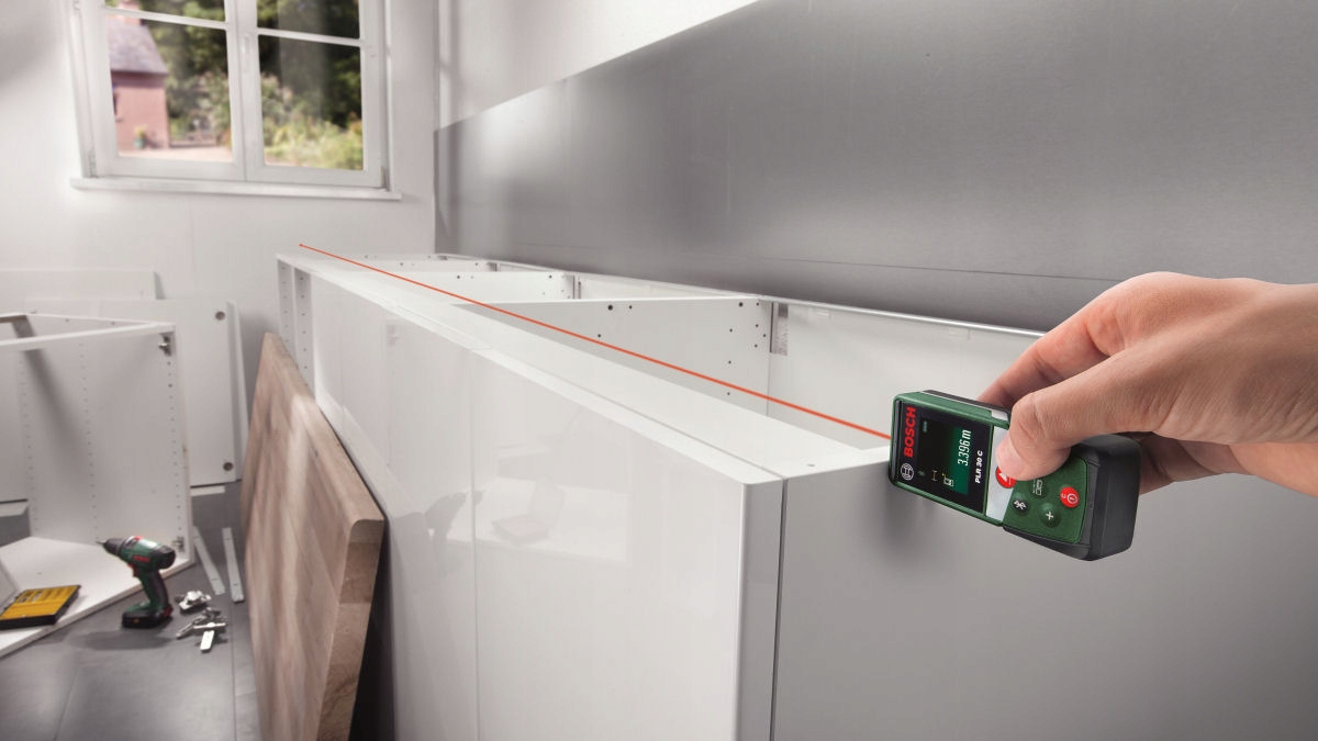 Дальномер PLR 30 C выполняет измерения с абсолютной точностью: на расстоянии до 30 метров, измеряет длину с точностью +/- 2,0 мм. Просто наведите лазерный луч на конечную точку измерения, и если пользователь дополнительно после длины измерит ширину, прибор автоматически рассчитает площадь помещения. При дополнительном измерении высоты на дисплее появится расчетный объем помещения.