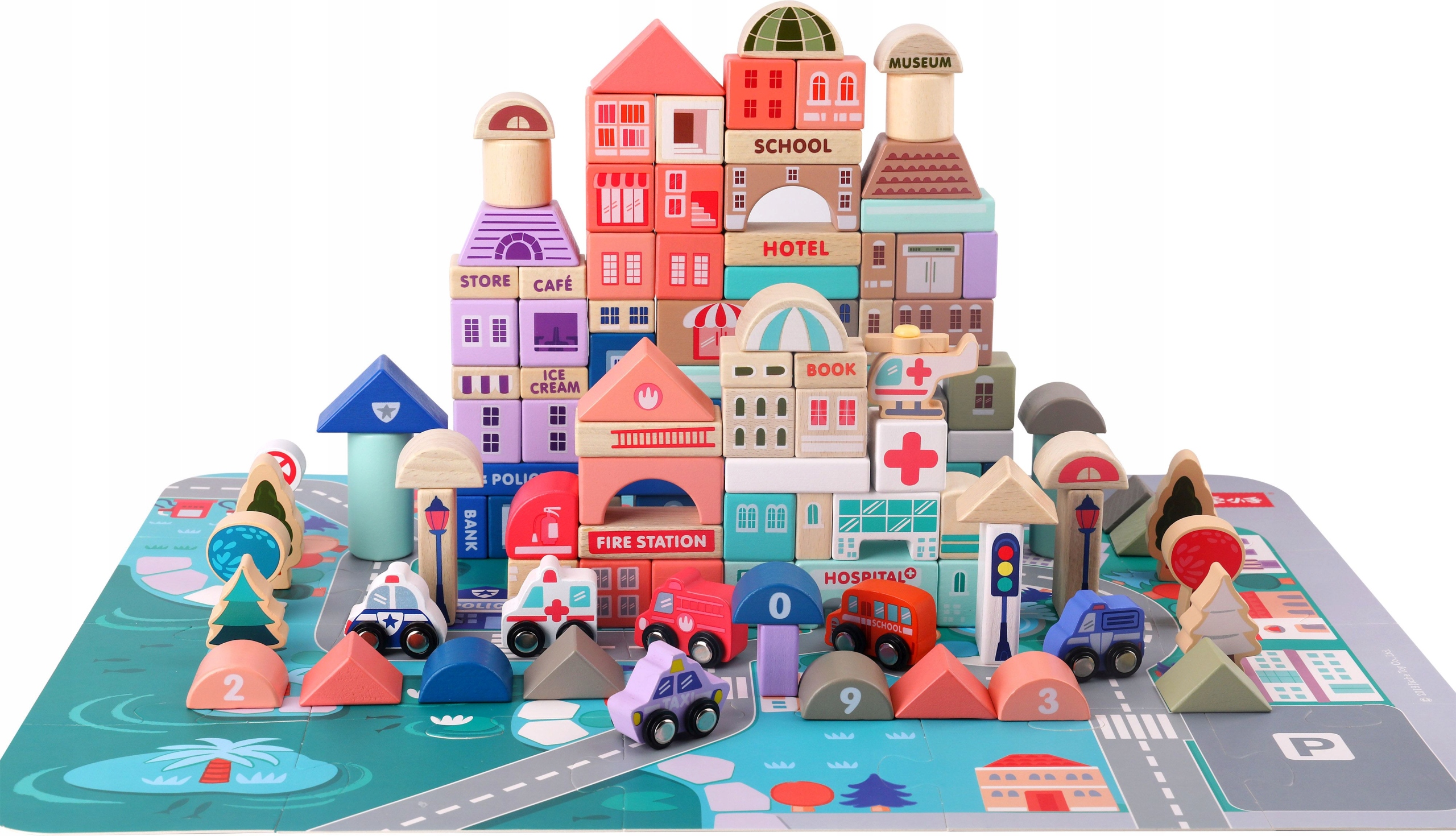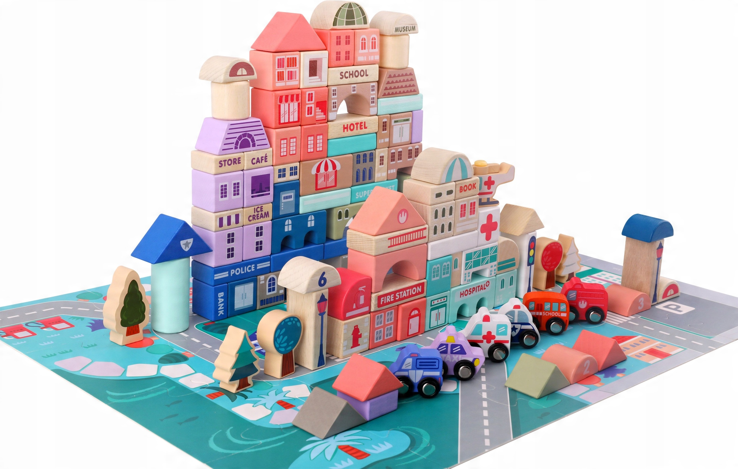 KOLOROWE DREWNIANE KLOCKI MIASTO 115el Montessori
