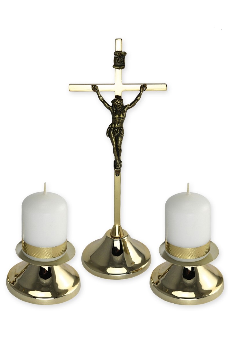 В комплект входит крест и два подсвечника, которые мы продаем вместе со свечами .
