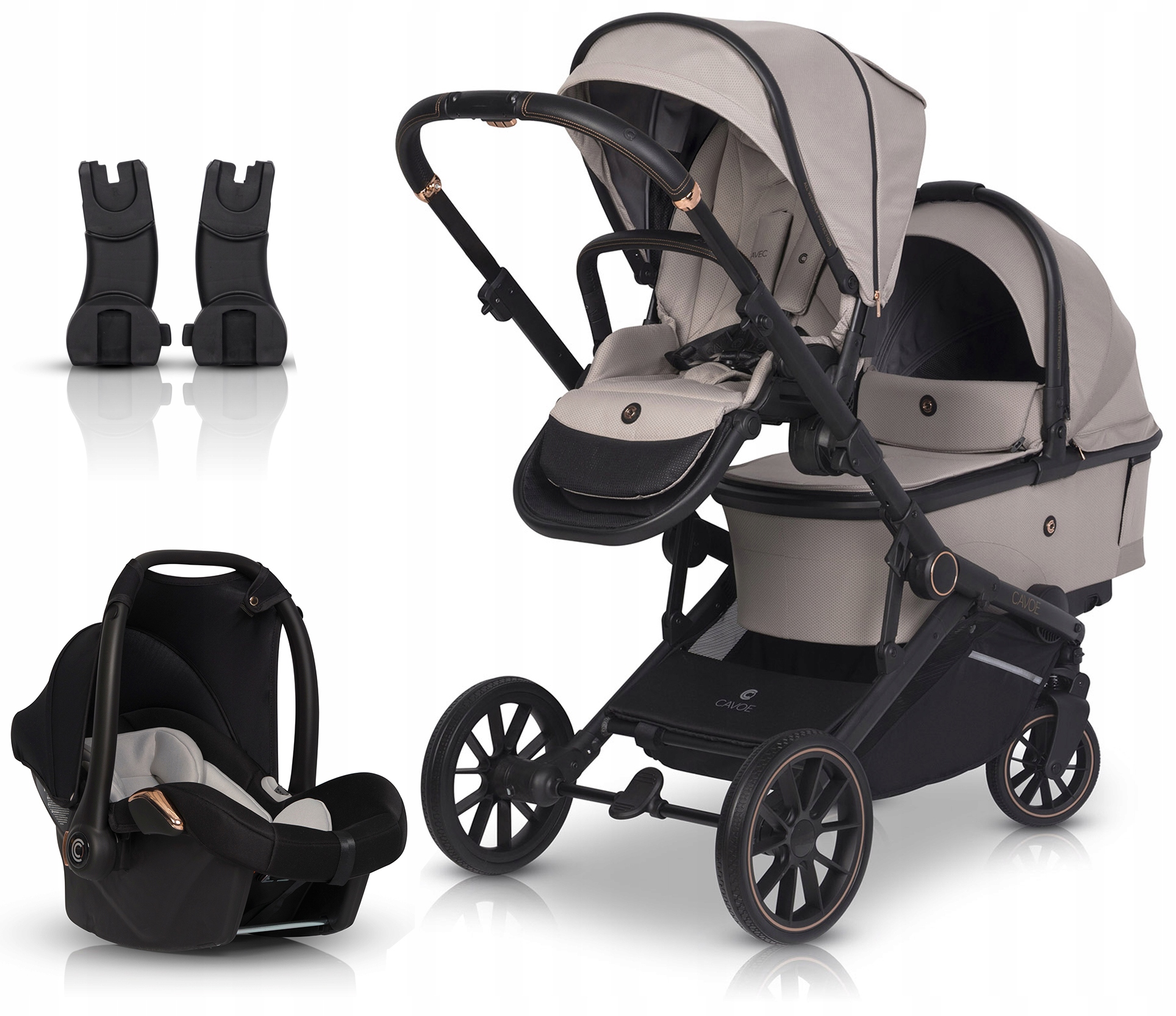 AVEC от CAVOE — коляска-тандем для двоих детей. Предлагается в виде коляски с двумя полноразмерными сиденьями и возможностью приобретения одной или двух полноразмерных гондол. Кроме того, бренд CAVOE предлагает возможность приобретения универсальных адаптеров, с помощью которых можно прикрепить одно или два автокресла CAVOE 0+ Isofix Ready или отдельные сиденья других известных производителей. мировых брендов, включая Maxi Cosi, Cybex и Avionaut.