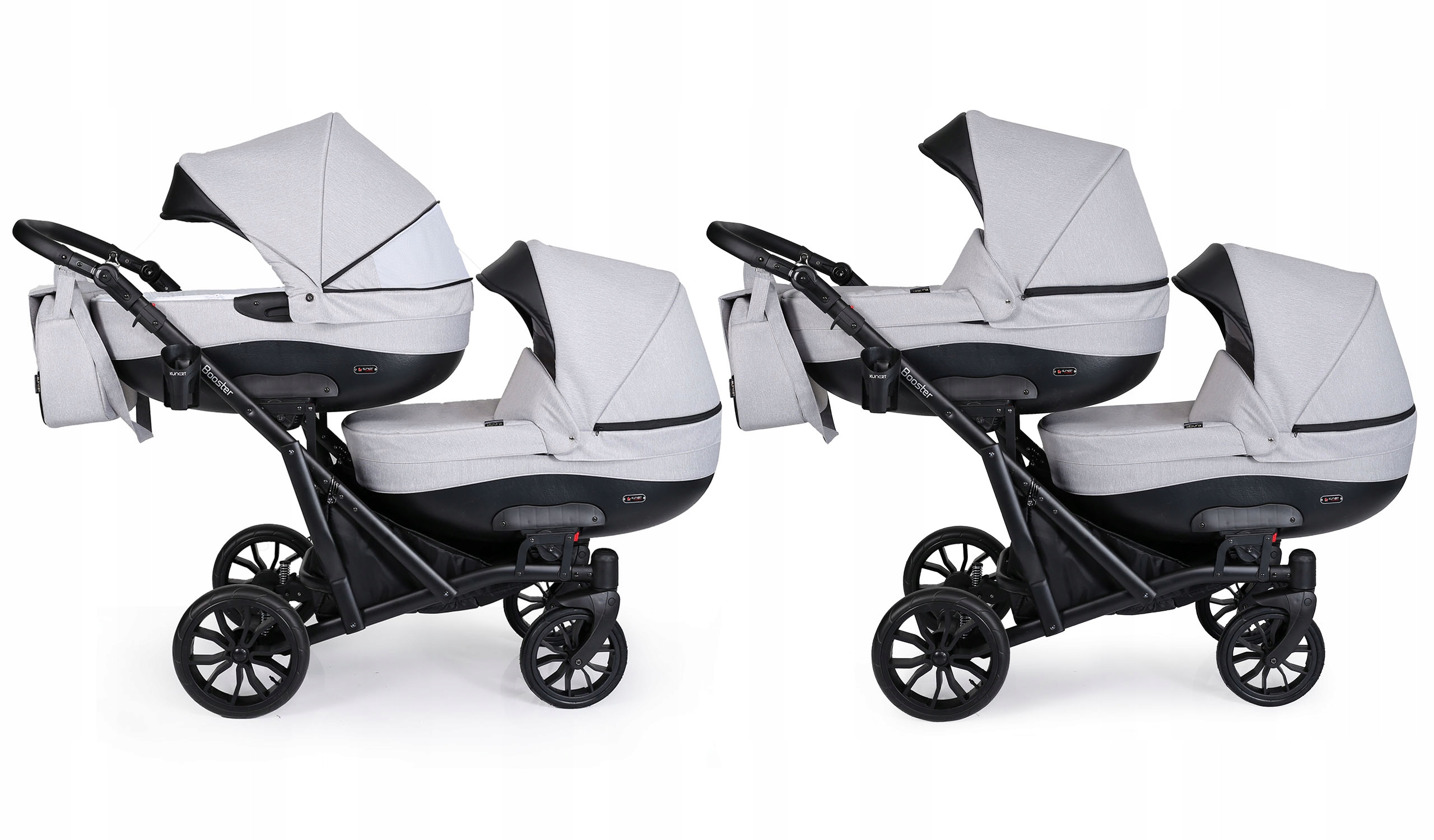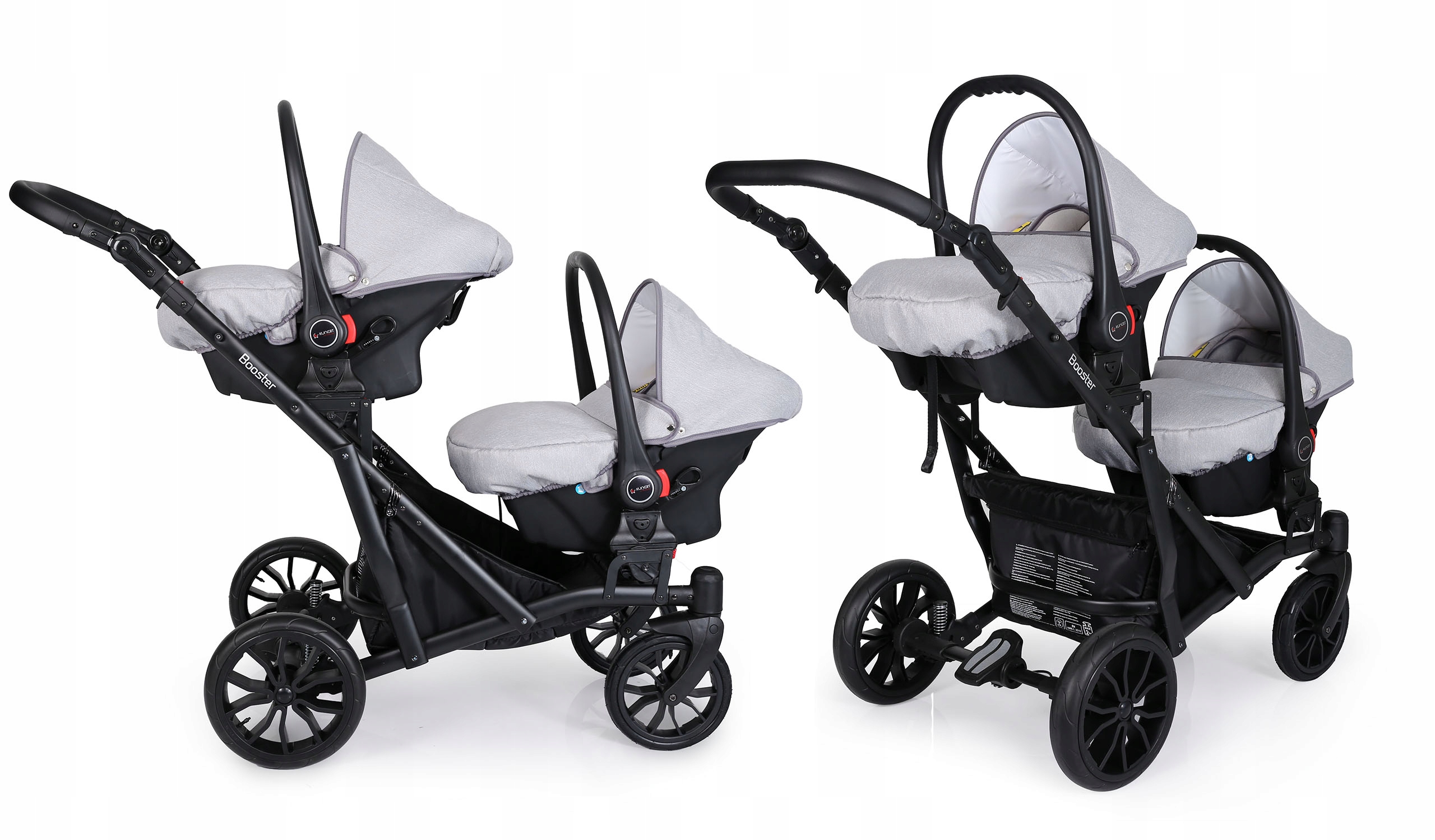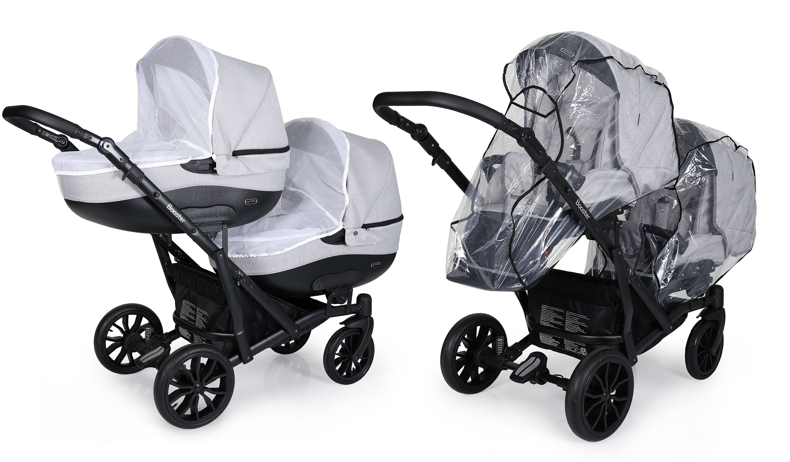 Наша коляска будет служить вам верой и правдой с первых мгновений жизни вашего малыша. Он станет неразлучным спутником каждой прогулки, каждого похода в магазин, визита к родным и друзьям. Коляска для двойни 3в1 Booster предназначена для детей от 0 до 36 месяцев (макс. 15 кг). В представленный ниже комплект входят рама коляски, две гондолы, две коляски, два автокресла, две москитные сетки и два дождевика.