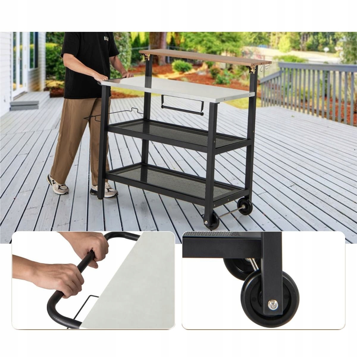 Универсальность в использовании: эта коляска больше, чем просто помощник во время гриля. Он может действовать как кухонный остров, подставка для пиццы, а также стол для садовой работы, такой как размещение растений. Благодаря его универсальности, это идеальное дополнение как к интерьеру, так и для террасов или садов.