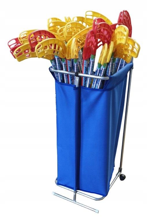 Практическая тележка для палок и аксессуаров UNIHOC станет прекрасным дополнением к оборудованию спортивного зала. В нем можно разместить около 20–30 клюшек, мячей и других аксессуаров. В комплект входит сумка для палочек из кодуры, прочного и водонепроницаемого материала, и стальная конструкция с порошковым покрытием. Тележка оснащена двумя поворотными колесами на 360 градусов, которые облегчают перемещение корзины по тренировочному залу.