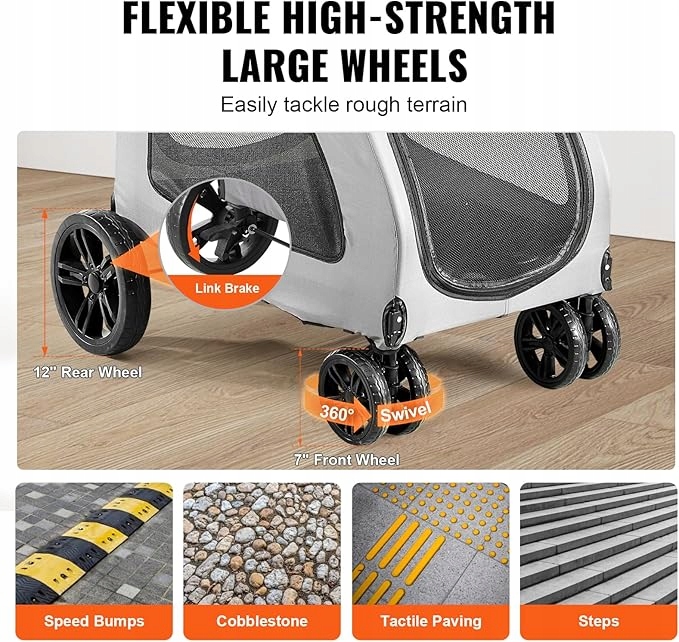 Эта коляска для собак, оснащенная гибкими большими колесами из этиленвинилацетата, гарантирует комфортную езду по любой поверхности. Благодаря 7-дюймовым передним и 12-дюймовым задним колесам он обеспечивает стабильную и плавную езду, а передние колеса, поворачивающиеся на 360°, позволяют легко маневрировать даже в ограниченном пространстве. Кроме того, надежная тормозная система Link обеспечивает безопасность во время каждой поездки, гарантируя вам спокойное путешествие с вашим пушистым другом.