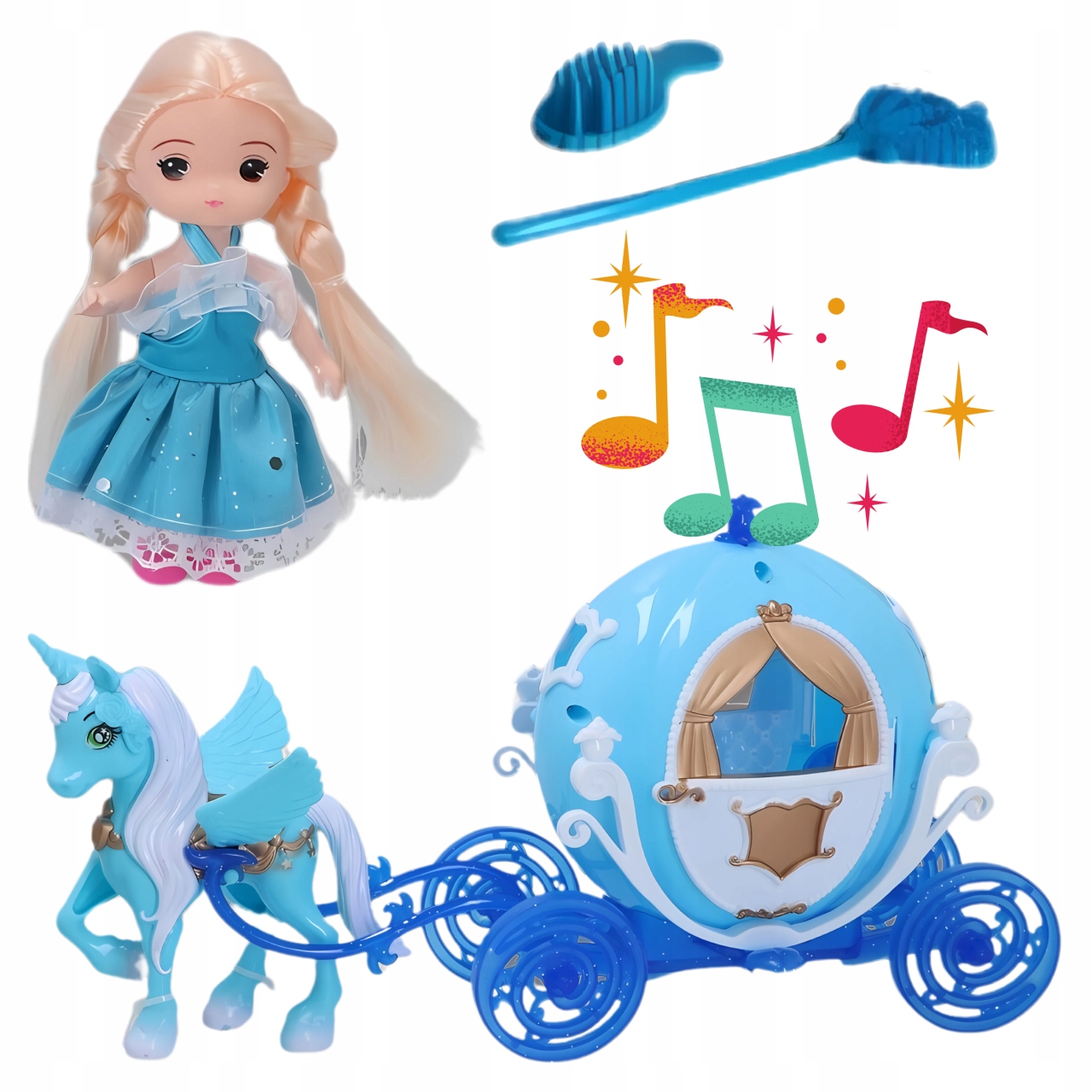 Набор: Коляска с принцессой и единорогом – идеальная игрушка для каждой девочки, мечтающей о сказочных приключениях. У очаровательной куклы есть расческа и синяя палочка, а все это дополняет шарообразная каретка, которая светится и играет после вставки батареек