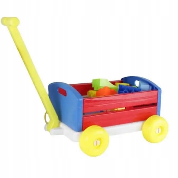 Пластиковая тележка/лебедка для игрушек в веселых цветах, безусловно, заинтересована меньшим и большим детям.