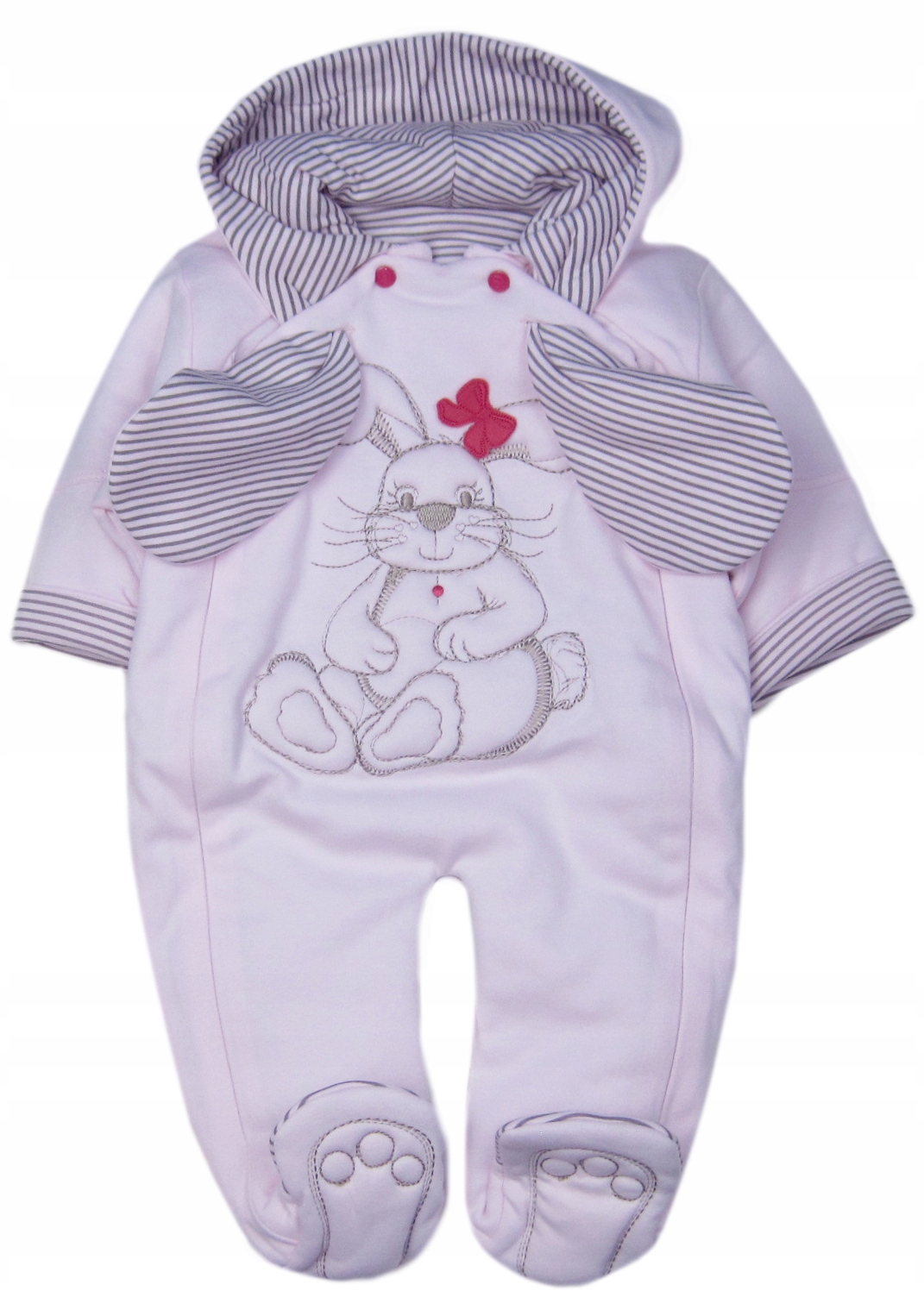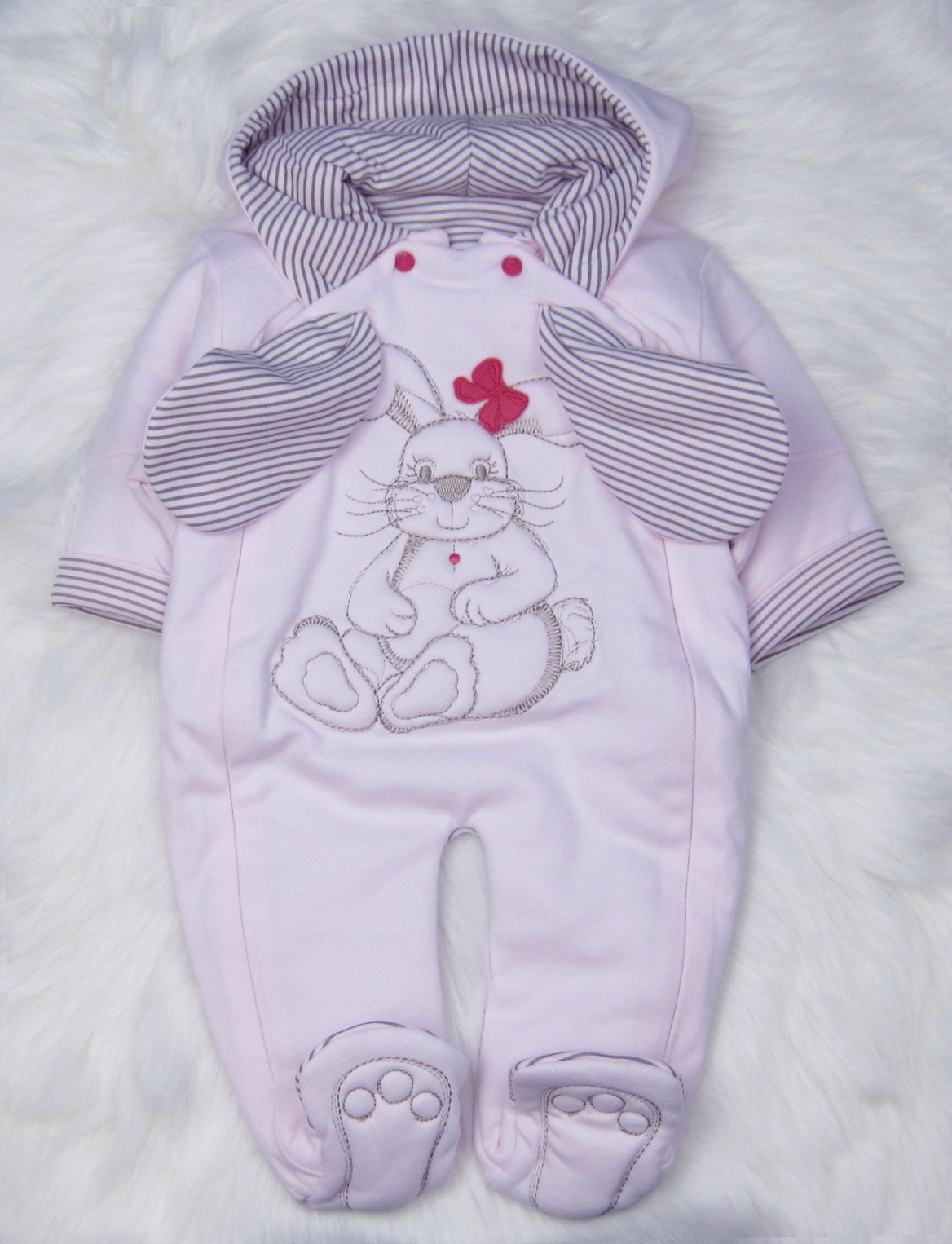 - Розовый комбинезон. С капюшоном, застегивающимся на две молнии.