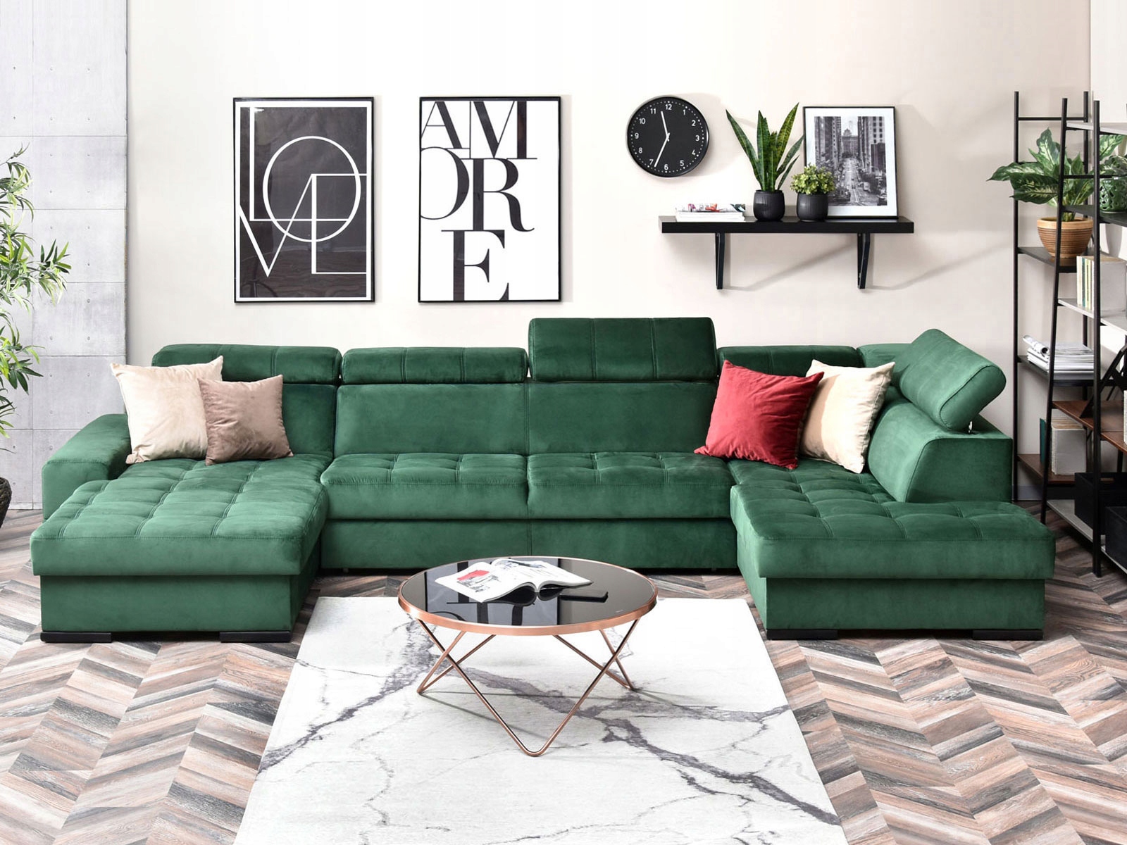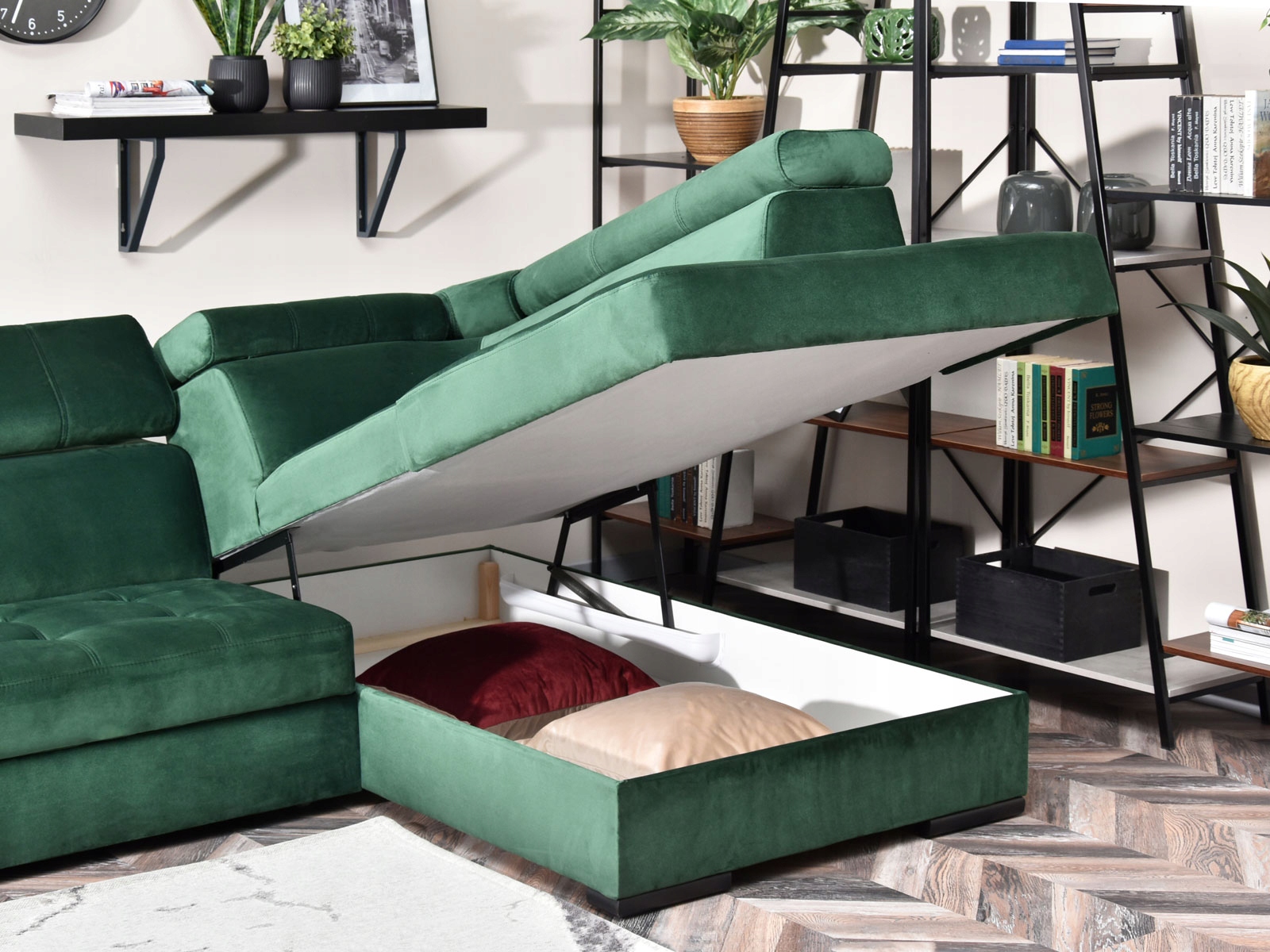 Большой угловой диван со спальной функцией, с большой поверхностью, очень удобный. Угловой диван имеет два удобных шезлонга, которые также служат контейнерами.
