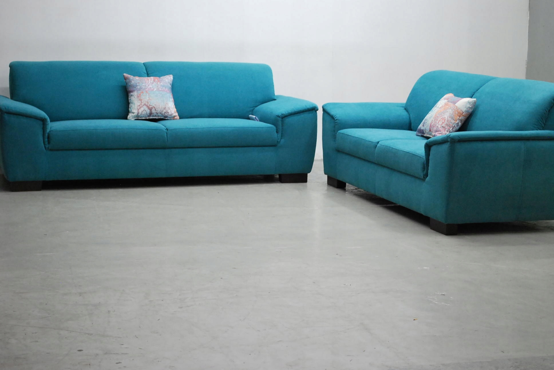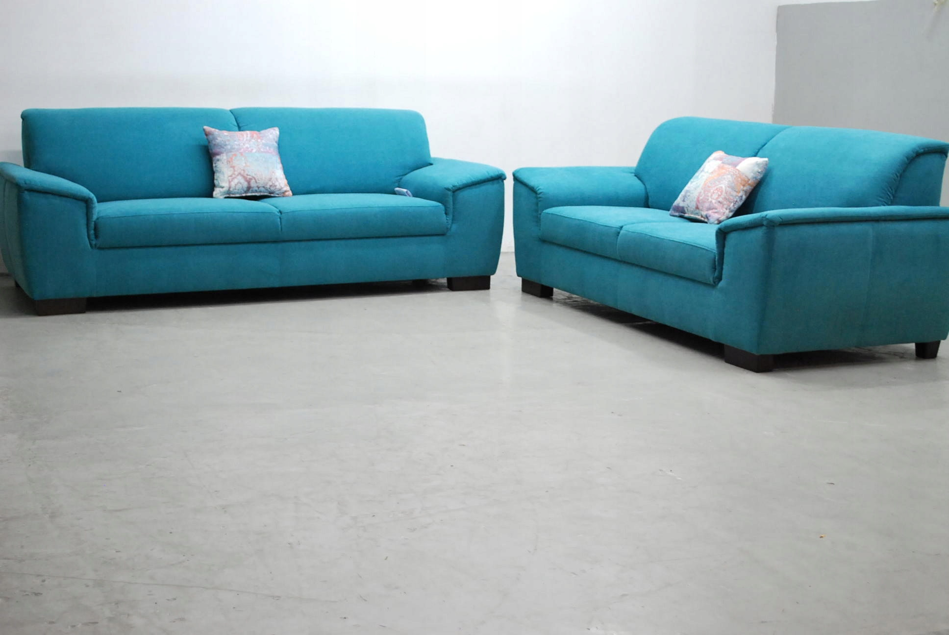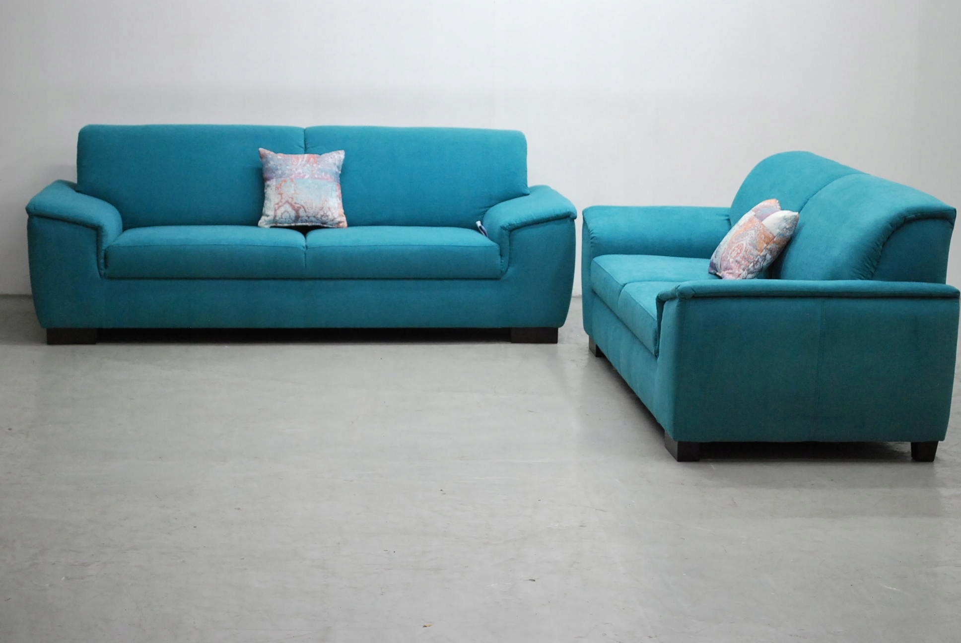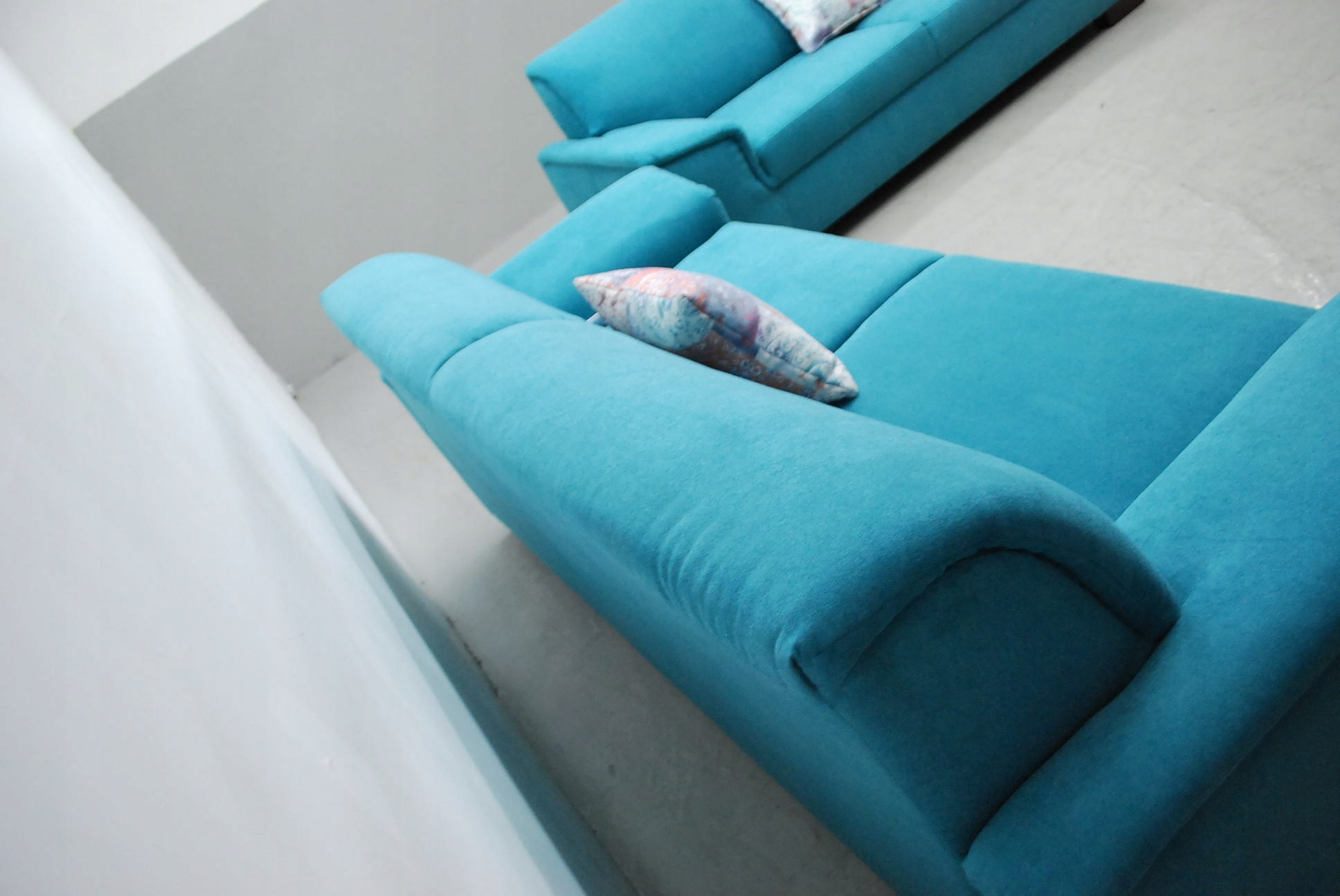 Комплект абсолютно новый, выполнен из качественной ткани. Ткань приятная на ощупь и напоминает замшу. Диван лазурного цвета (SORO 86).Диваны не имеют функции спального места.