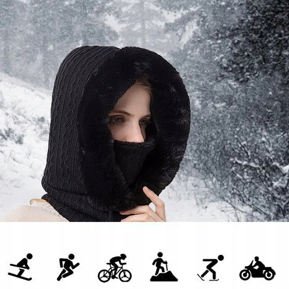 KOMINIARKA DAMSKA CZAPKA KAPTUR MASKA NA ZIMĘ CIEPŁA PLUSZOWA CZARNY
