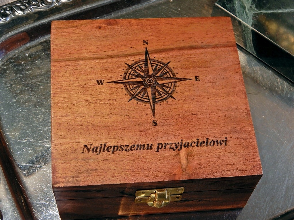 Мы делаем лазерную гравировку на ламинированном картоне и наклеиваем ее внутрь или на крышку коробки, прямо на дерево. p>