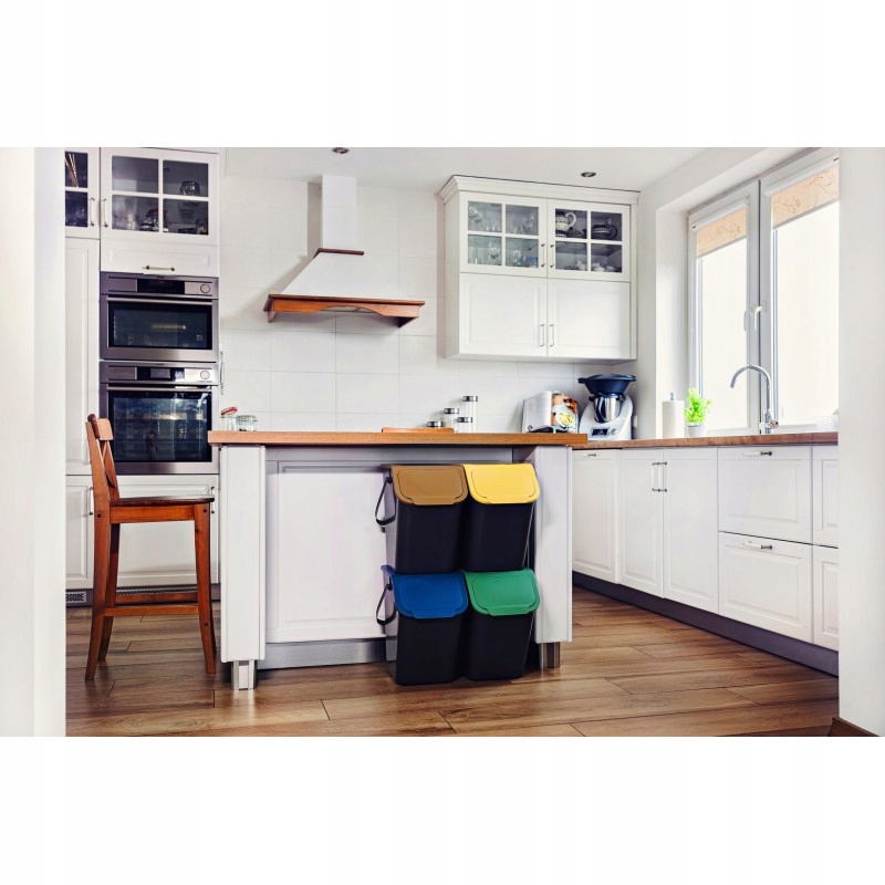 Четыре однокамерных контейнера, предназначенных для сбора отсортированных отходов. Они идеально подходят как для дома, так и для компаний, а также различных общественных мест, таких как школы, университеты и офисы. Изготовлен из высококачественного пластика. Оснащен цветной крышкой с отверстием, позволяющим легко выбрасывать мусор.