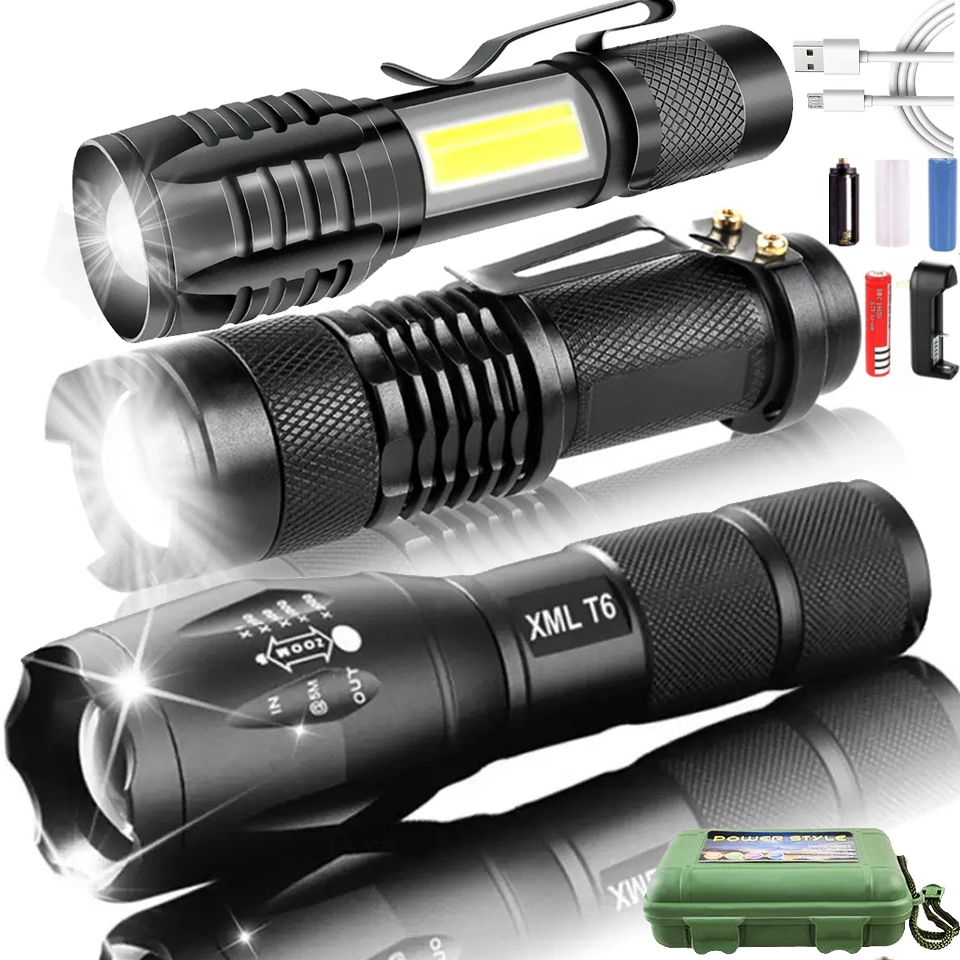 НАБОР 3 МОЩНЫХ СВЕТОДИОДНЫХ ТАКТИЧЕСКИХ ФОНАРЯКА CREE ZOOM XML-T6 + 2 ВОДОЗАНИЦАЕМЫХ Q5