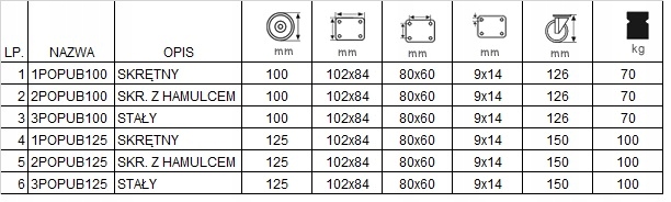 Комплект состоит из четырех колес, оснащенных пластинчатым креплением. В комплект входят два стационарных комплекта с кодом 3POPUB100K1 (поз. 3 в таблице) и два поворотных колеса с тормозом с кодом 2POPUB100K1 (поз. 2 в таблице). p>
