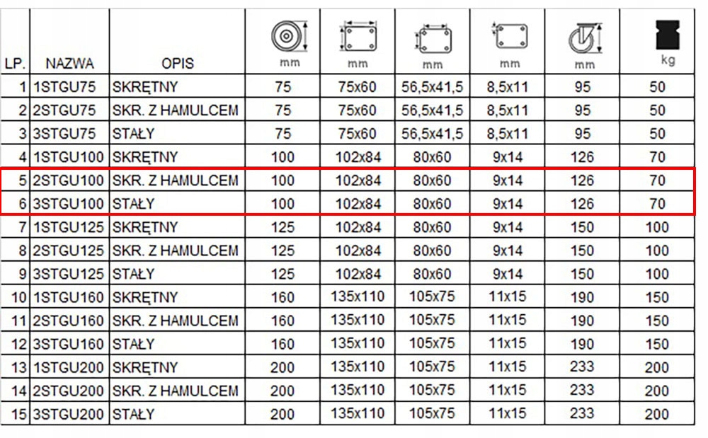 Комплект состоит из четырех колес, оснащенных пластинчатым креплением. В комплект входят два фиксированных комплекта с кодом 3СТГУ100 (поз. 6 в таблице) и два поворотных колеса с тормозом с кодом 2СТГУ100 (поз. 5 в таблице). .