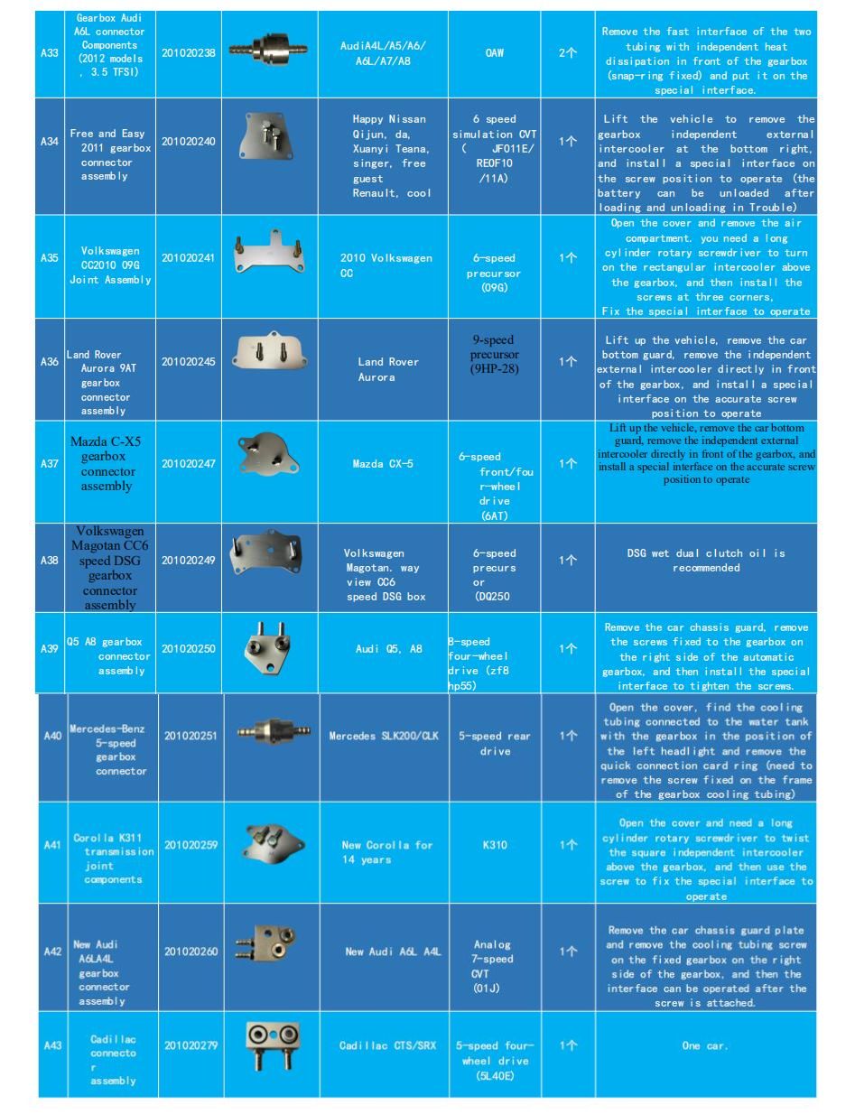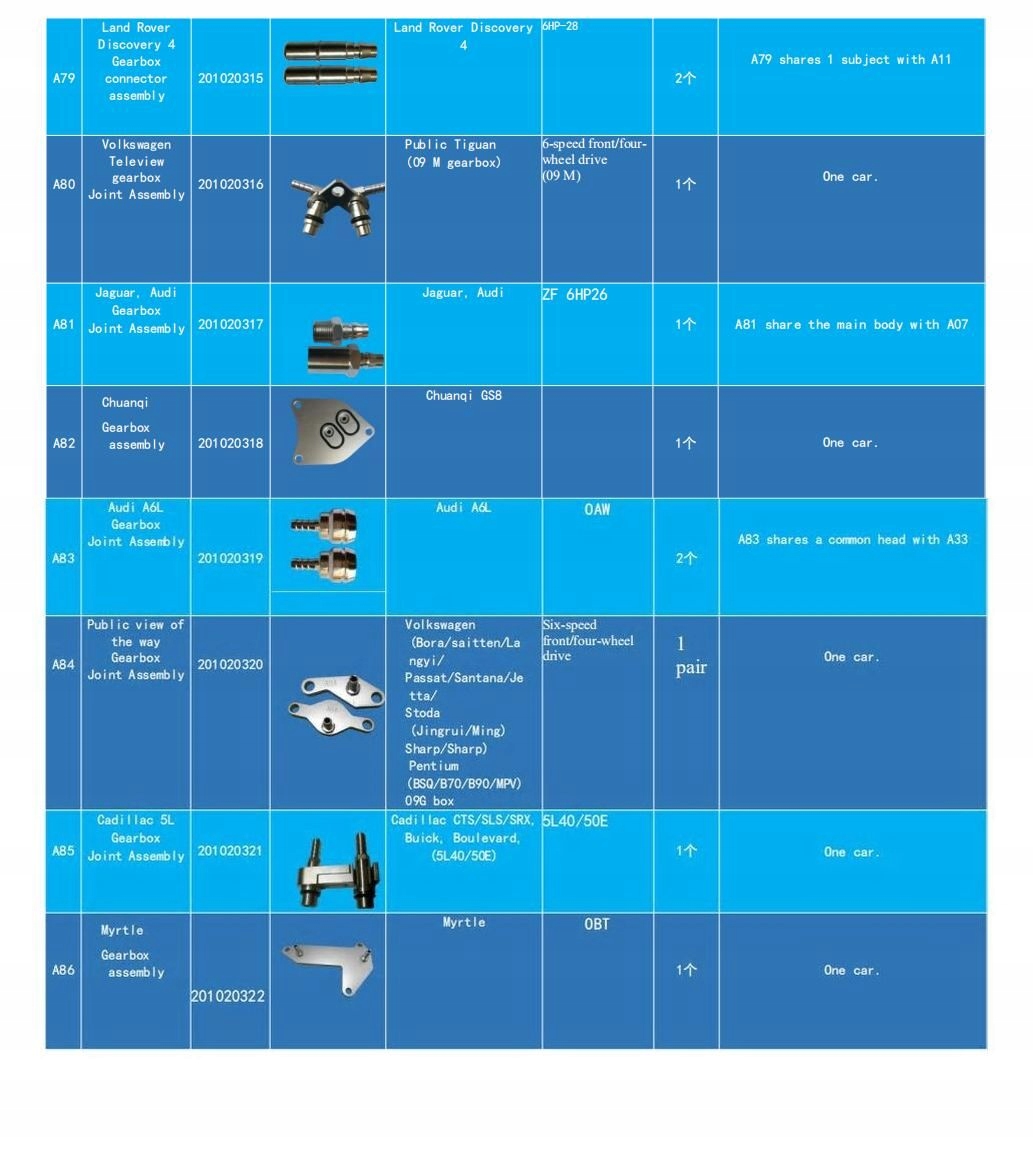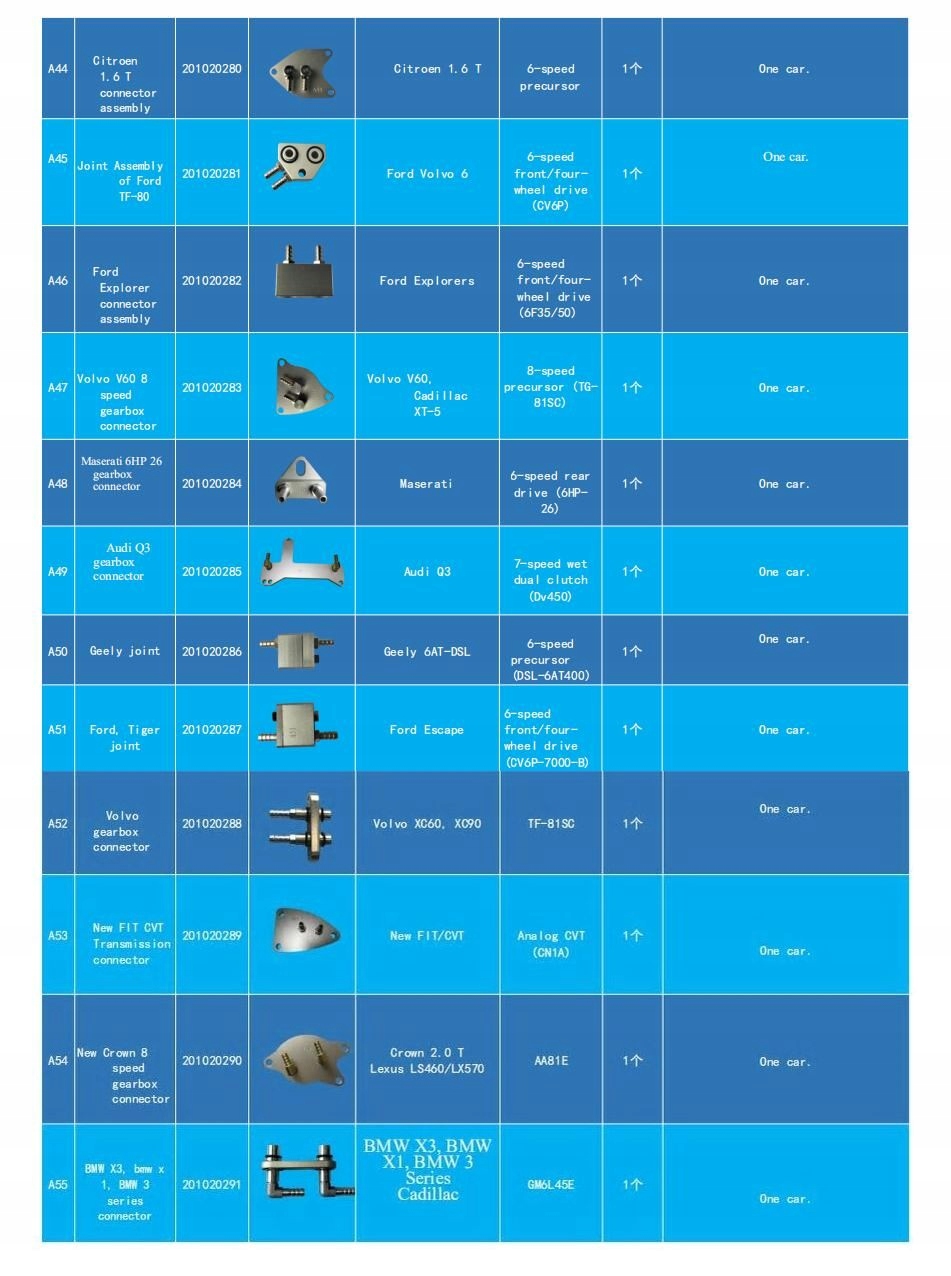 Комплект состоит из 130 элементов, подходящих для 90 типов коробок передач, которые используются более чем в 99% автомобилей на автомобильном рынке. Все детали изготовлены из прочного и прочного металлического сплава, что гарантирует хорошую герметизацию и отсутствие утечек масла. В галерее есть старый список со 116 предметами для 86 типов сундуков. Последняя версия включает 14 элементов.