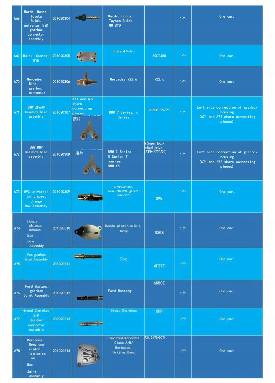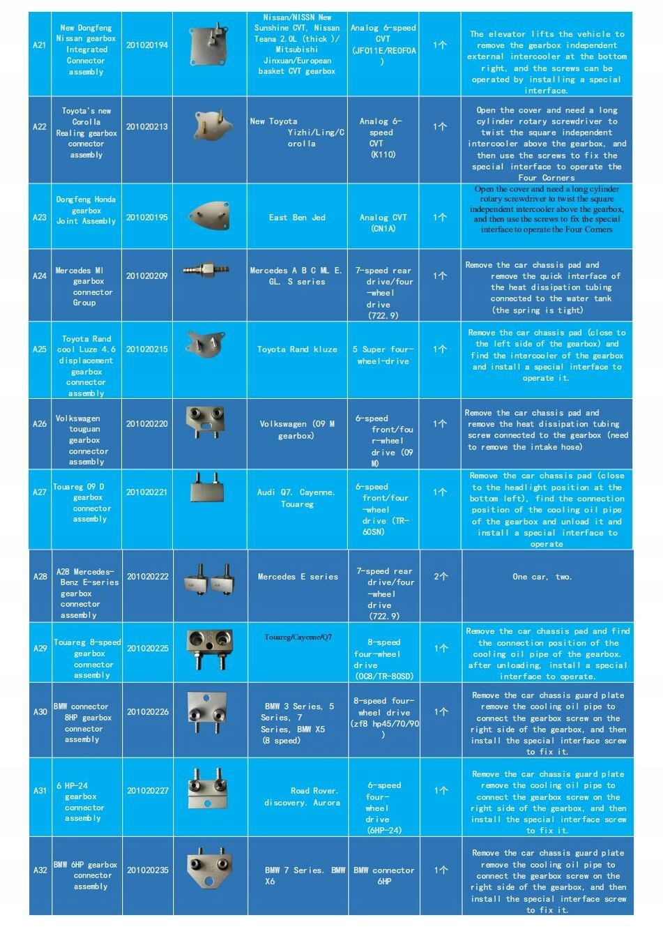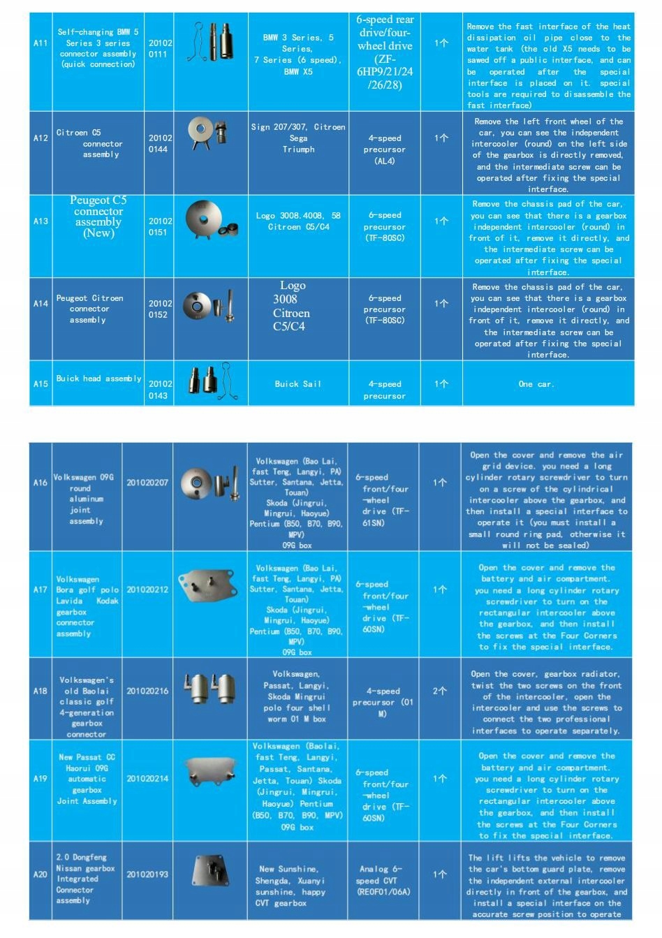 Комплект состоит из 130 элементов, подходящих для 90 типов коробок передач, которые используются более чем в 99% автомобилей на автомобильном рынке. Все детали изготовлены из прочного и прочного металлического сплава, что гарантирует хорошую герметизацию и отсутствие утечек масла. В галерее есть старый список со 116 предметами для 86 типов сундуков. Последняя версия включает 14 элементов.