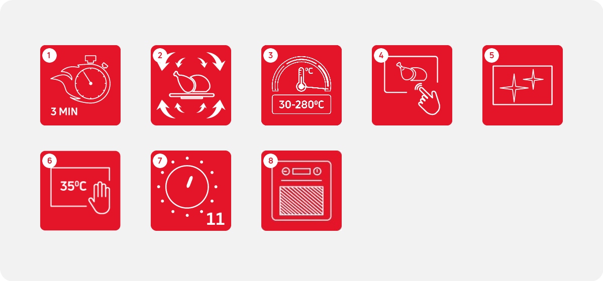 Идеальная выпечка – это не только вопрос мастерства, но, прежде всего, правильной духовки. Новая конструкция камеры гарантирует идеальное, равномерное распределение тепла и стабильную температуру во всей духовке. Благодаря этому вы сможете приготовить большую партию выпечки, зная, что она подрумянится и пропечется равномерно. Камера также стала больше и имеет больше уровней выпечки — теперь можно убить сразу нескольких зайцев! Противни также стали больше, а новая крышка вентилятора ускоряет нагрев — до 150°C всего за 3 минуты! С BakingPro System® вы сможете печь больше, быстрее, лучше и удобнее – и повседневные дела станут удовольствием!