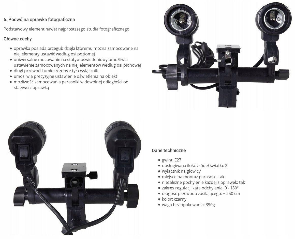 Благодаря этой рамке мы можем быстро и надежно соединить лампу-вспышку (лампочку) с лампой. зонт и осветительную стойку, таким образом получая полноценный элемент фотостудии. Он также служит держателем для постоянных люминесцентных ламп.