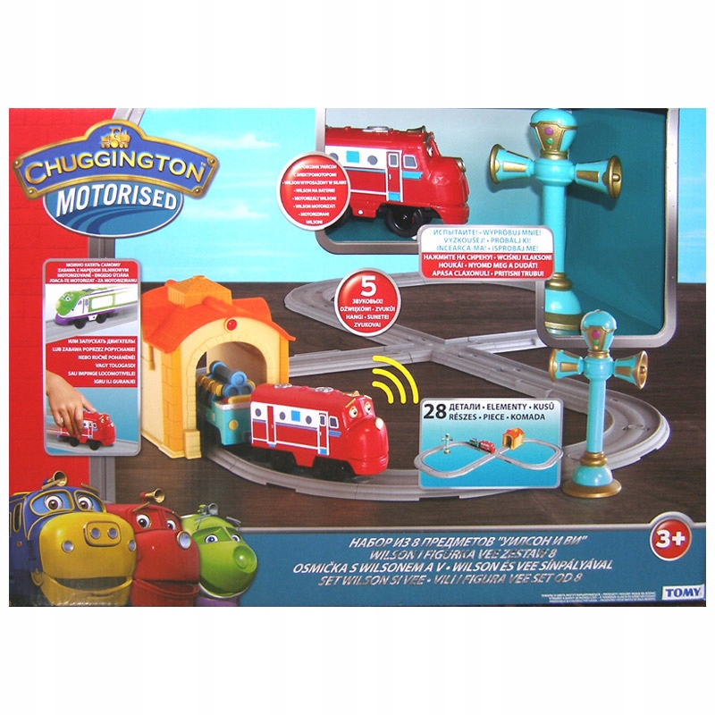 Серия игрушек с мотором. Самоуправляемый локомотив со звуковыми эффектами на батарейках, герой известного всем детям сериала «Чаггингтон». Набор состоит из набора рельсов, локомотива с вагоном, домика и Ви
