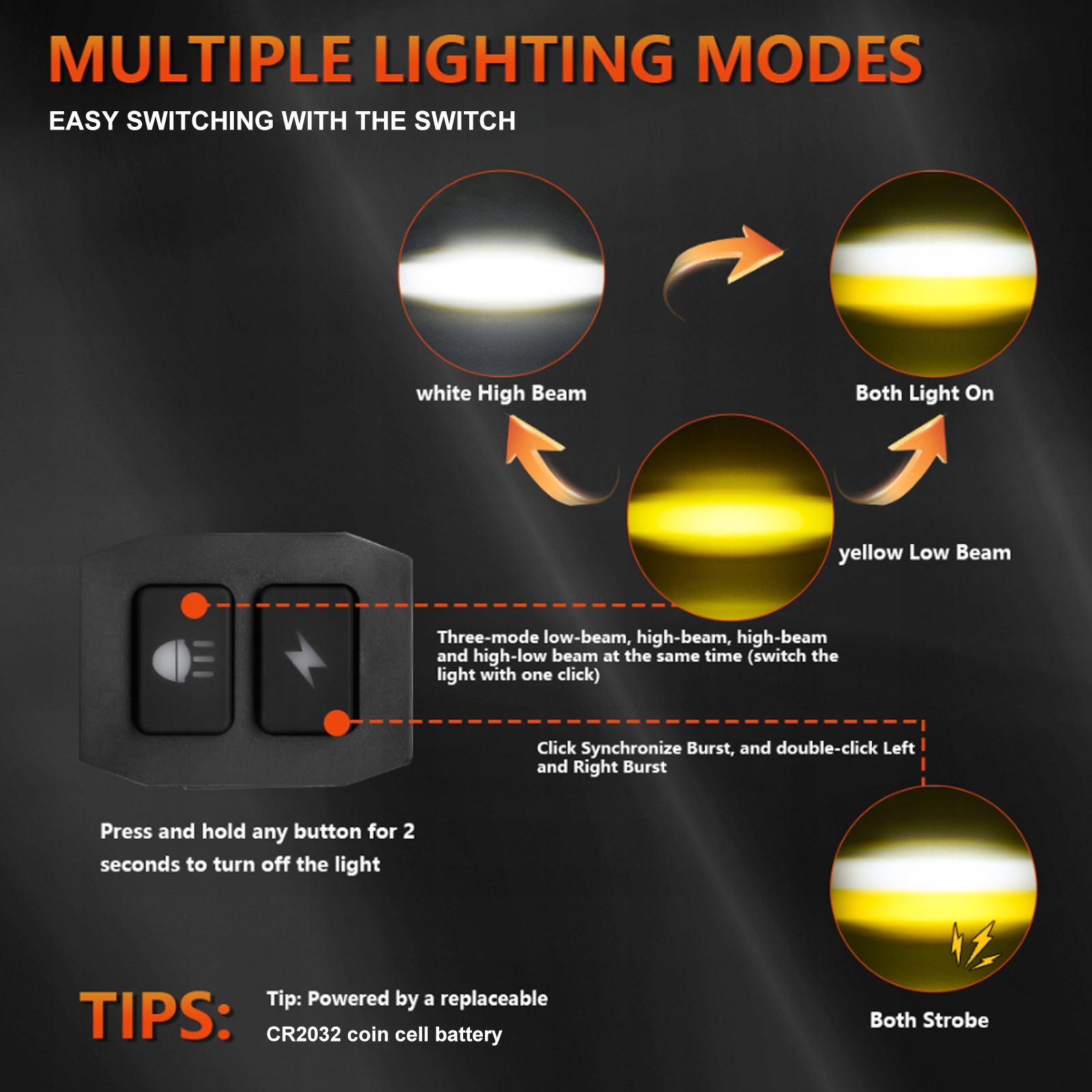2. Удобный беспроводной переключатель: с антенной длиной 1 м/3,28 фута и компактным переключателем для легкого переключения режимов (включая стробоскоп) и гибкого размещения, обеспечивающего легкое управление из любого положения.