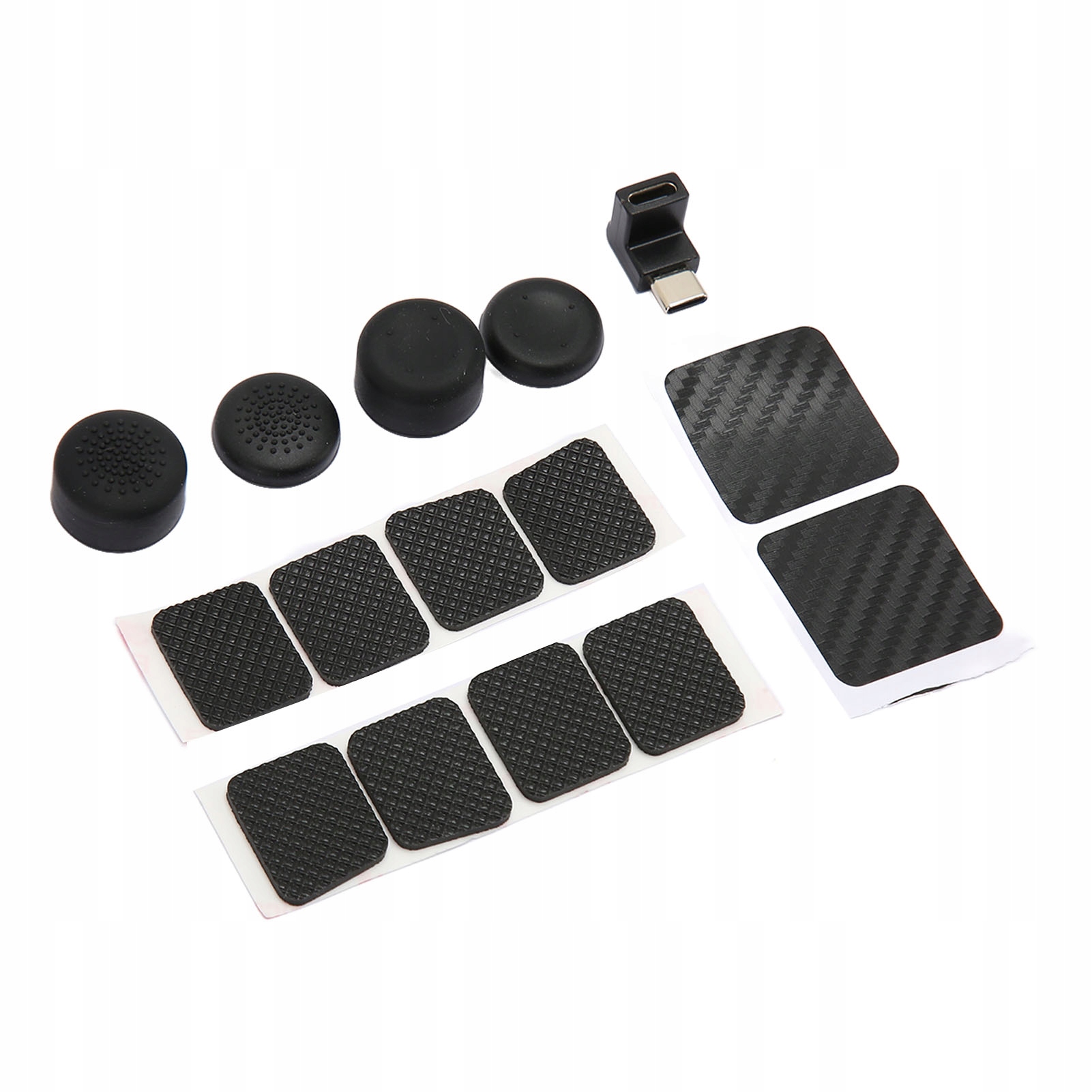 1. В КОМПЛЕКТ ВХОДИТ: В комплект входят 2 крышки сенсорной панели из искусственного углеродного волокна, 4 силиконовые крышки толщиной 1,5 мм, усиленные задними кнопками, 4 силиконовые крышки толщиной 2 мм, усиленные задними кнопками, 4 крышки джойстиков и 1 адаптер USB C "папа-мама" 90 градусов.