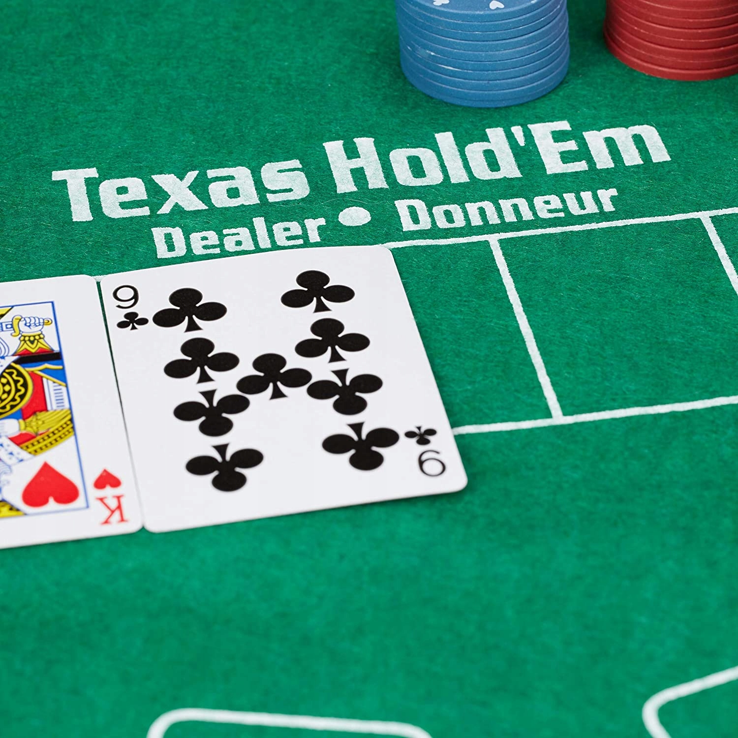 2 колоды карт, 200 фишек, кнопка дилера, малый блайнд, большой блайнд и покерный мат
