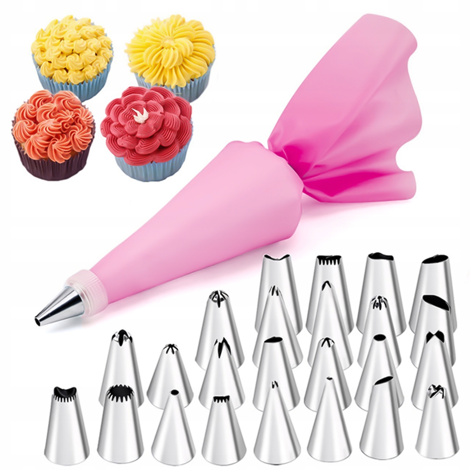 Благодаря нашему кондитерскому рукаву с взаимозаменяемыми советами, а также лопатками и расчески, вы можете легко получить профессиональные эффекты. Набор из 24 наконечников рукава позволяет вам вызывать различные узоры. Установка всего набора очень проста, как и складывание и очистка. Силиконовый рукав и многоразовые лезвия достаточно, чтобы промыть под водой с добавлением моющего средства - стальные кончики подходят для мытья в посудомоечной машине!