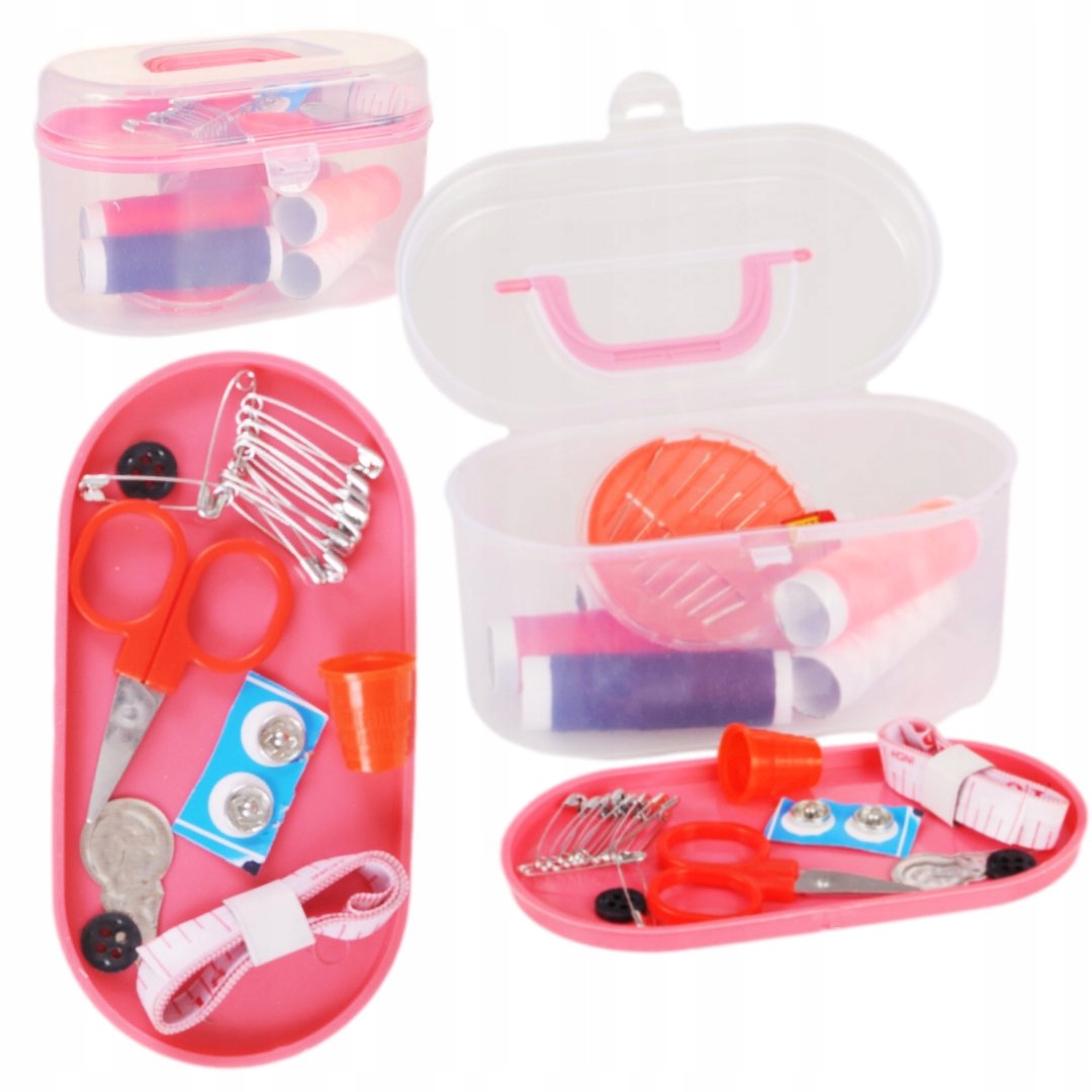 В наборе все основные вещи, необходимые для шитья или для ремонта одежды. Чехол состоит из двух частей - основного контейнера, в котором находятся нитки и иголки, и верхней крышки с другими предметами.