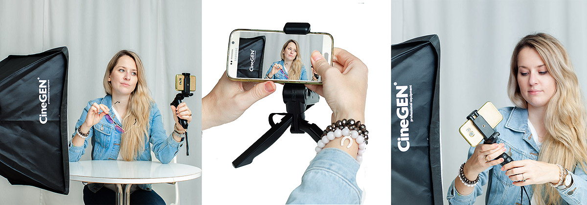 Основой набора является компактная ручка, которая одновременно служит настольной подставкой. Интересная и продуманная конструкция обеспечивает отличные эффекты (в основном стабилизацию кадров в движении) при использовании любительской и полупрофессиональной техники (мобильные телефоны, беззеркальные фотоаппараты, камеры GoPro®). Вторая часть комплекта — софтбокс, штатив и фотолампа, которая освещает кадр во время записи и фотосъемки. Незаменима для получения ярких снимков.