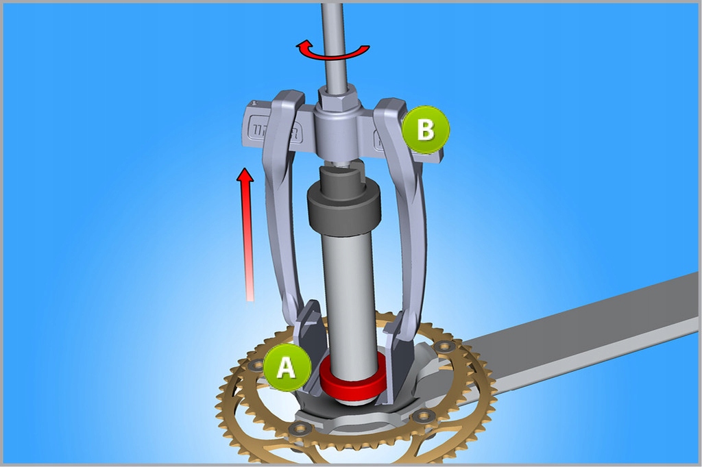 Чтобы снять подшипник с кривошипа, используйте универсальный съемник (В) вместе с удлинителем съемника (А).