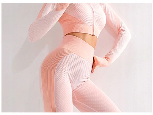 В комплекте включает в себя длинную рубашку для молнией, леггинсы, спортивный бюстгальтер