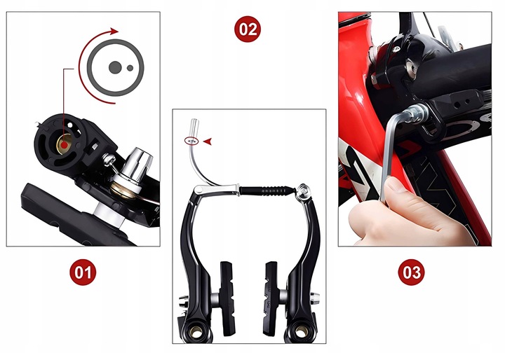 Тормозная арка велосипеда имеет размер ок. 110 мм/4,3 дюйма, тормозная колодка 55 мм/2,1 дюйма, тормозные магистрали длиной 2 м, держатель велосипедного тормоза подходит для руля диаметром 2,2 см/0,87 дюйма, который можно установить на большинство велосипедов
