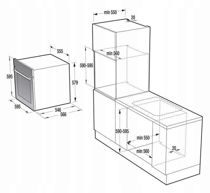 - Минимальная высота установочной ниши: 590 мм
