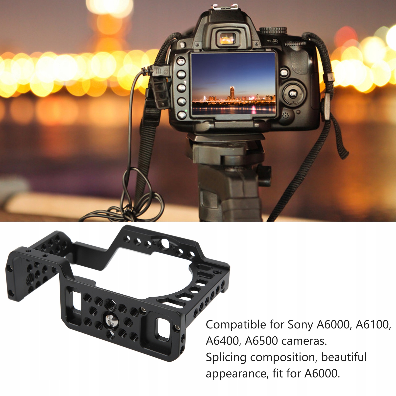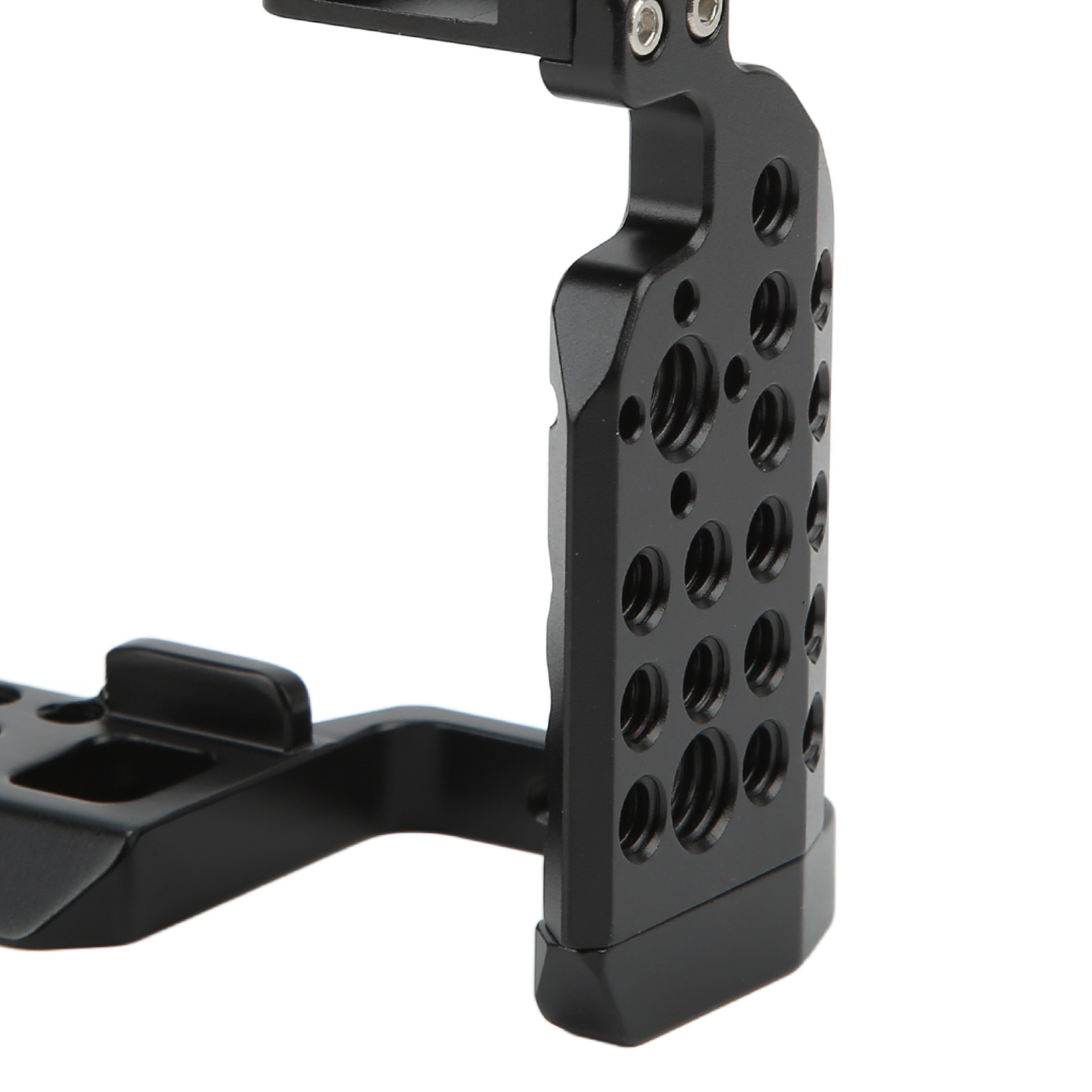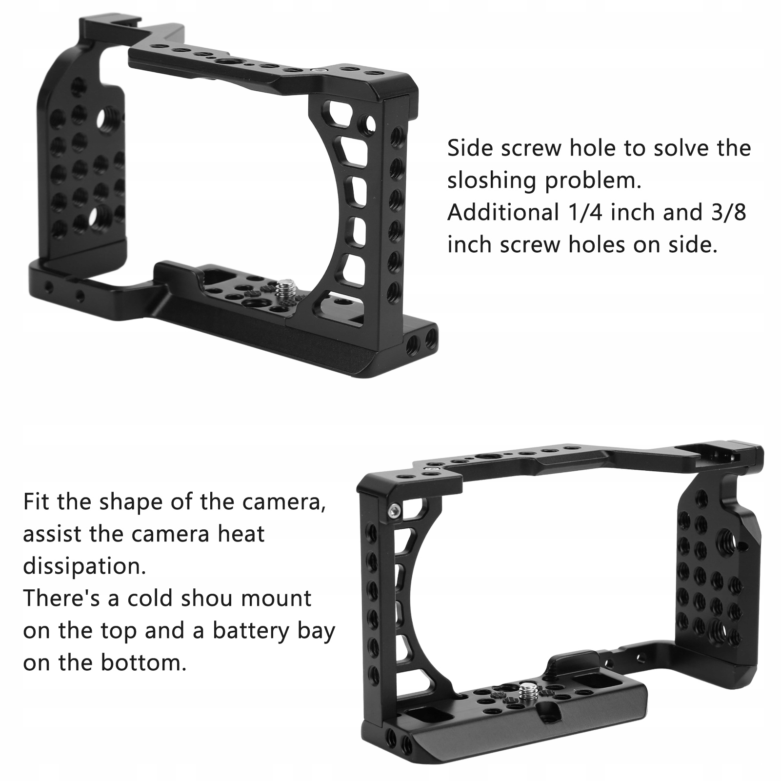 1. С опорами для холодной обуви: Клетка включает в себя опоры для холодной обуви, резьбовые отверстия 1/4 дюйма, 3/8 дюйма и позиционирующие отверстия. Совместим с камерами Sony A6000, A6100, A6400, A6500.