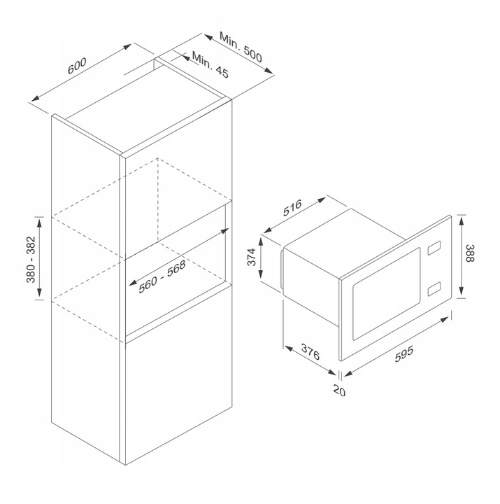 - Монтажное отверстие (В X Ш X Г): 380 x 560 x 500 мм.